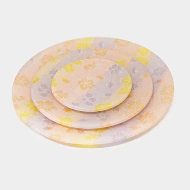 西陣織工業組合に認定された西陣織に特殊なガラスコーティングを施したピンク色のお皿です。日本を代表する桜をモチーフにしたお皿の5点セット(L*1枚、M*2枚、S*2枚)です。