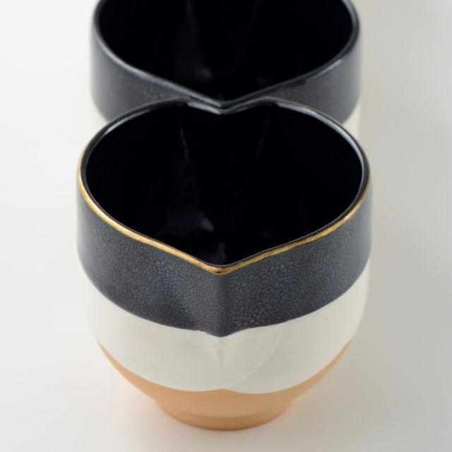(約1ヶ月の工程)赤土+白化粧+油滴天目(内側)+油滴天目(外側)+金線の覆輪、柔らかい曲線と工業的な直線の共存により斬新な形状に仕上げています。