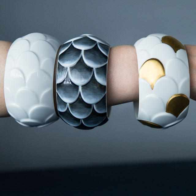 ドイツを拠点に活動するジュエリーデザイナーのサスキア・ディーツは日本でよく使われているモチーフ、鱗を用いた磁器のジュエリーをデザインしました。
