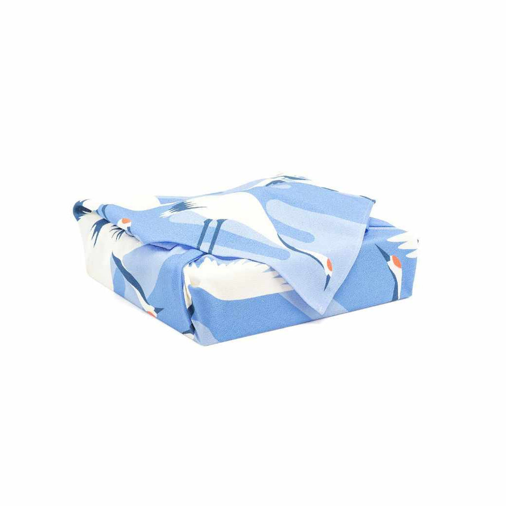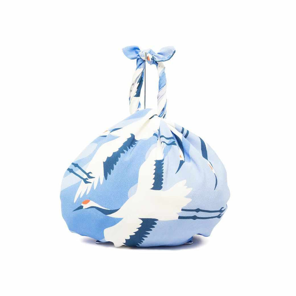 デザインイメージは、重要文化財の「鶴図下絵和歌巻」。日本の芸術様式である琳派の始祖、俵屋宗達が描いた、躍動的な鶴の姿を風呂敷のデザインに落とし込んでいます。