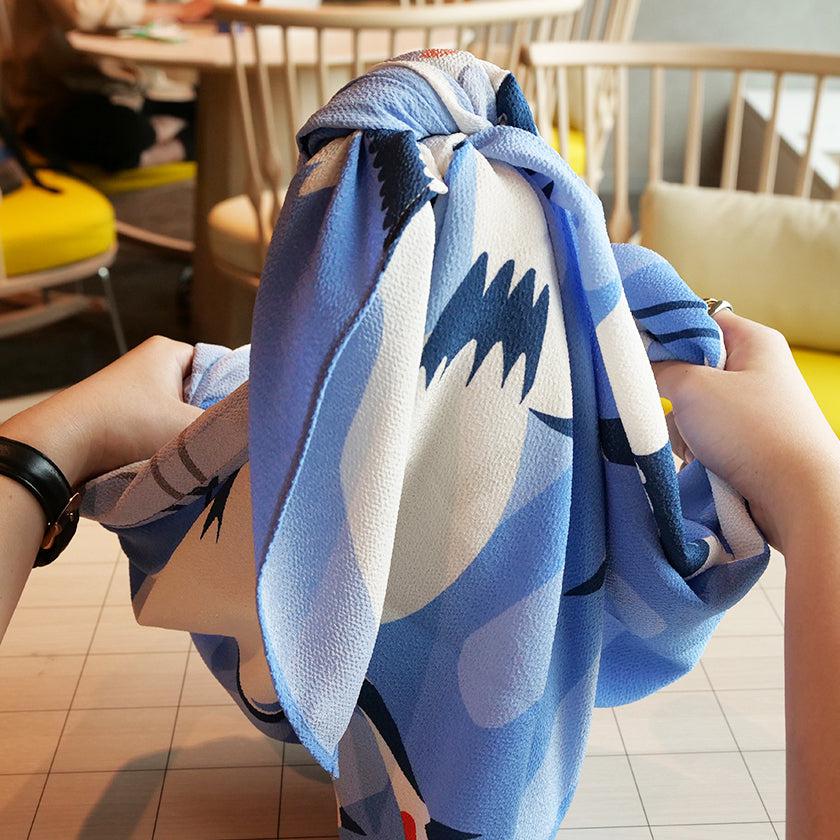 例えば、買い物でスーパーに行った時には、四隅をくくるだけでエコバックに。突然の雨で傘を持っていないときには、さっとかぶれば傘がわりに。