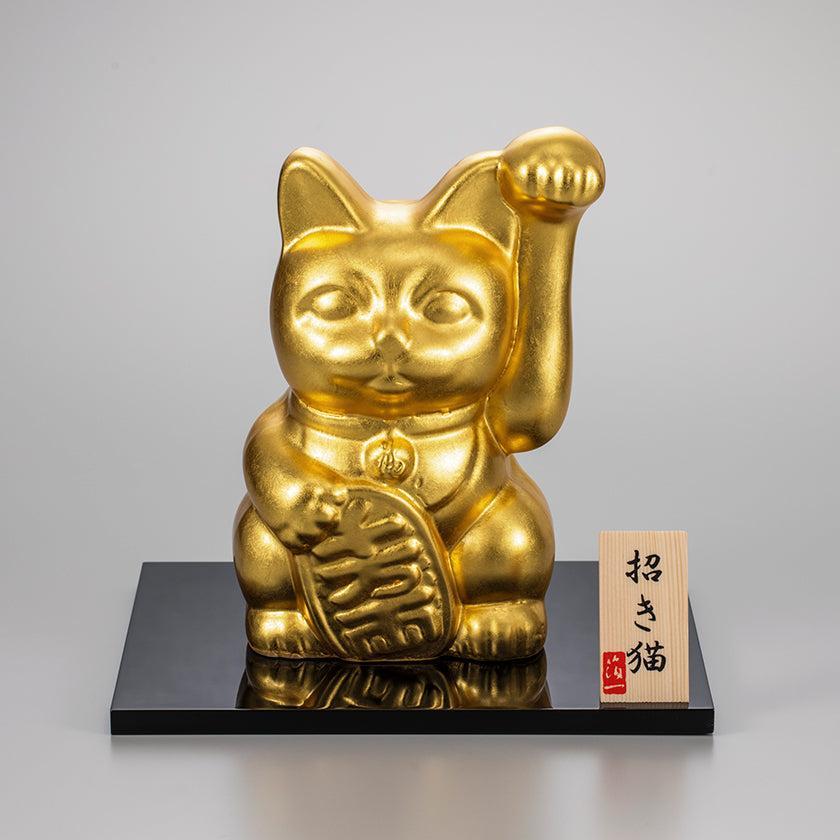 大きなサイズで運気アップ!Lサイズの招き猫です。右手・左手の2種類をご用意しており、上げた手によってお金や人などを呼び込んでくれます。細部まで精巧に作り込まれた置物は、金沢箔でさらに豪華に。台座や立て札付きで、高級感抜群です。開店・開業祝いをはじめ、さまざまなお祝いの贈り物としてご活用ください。