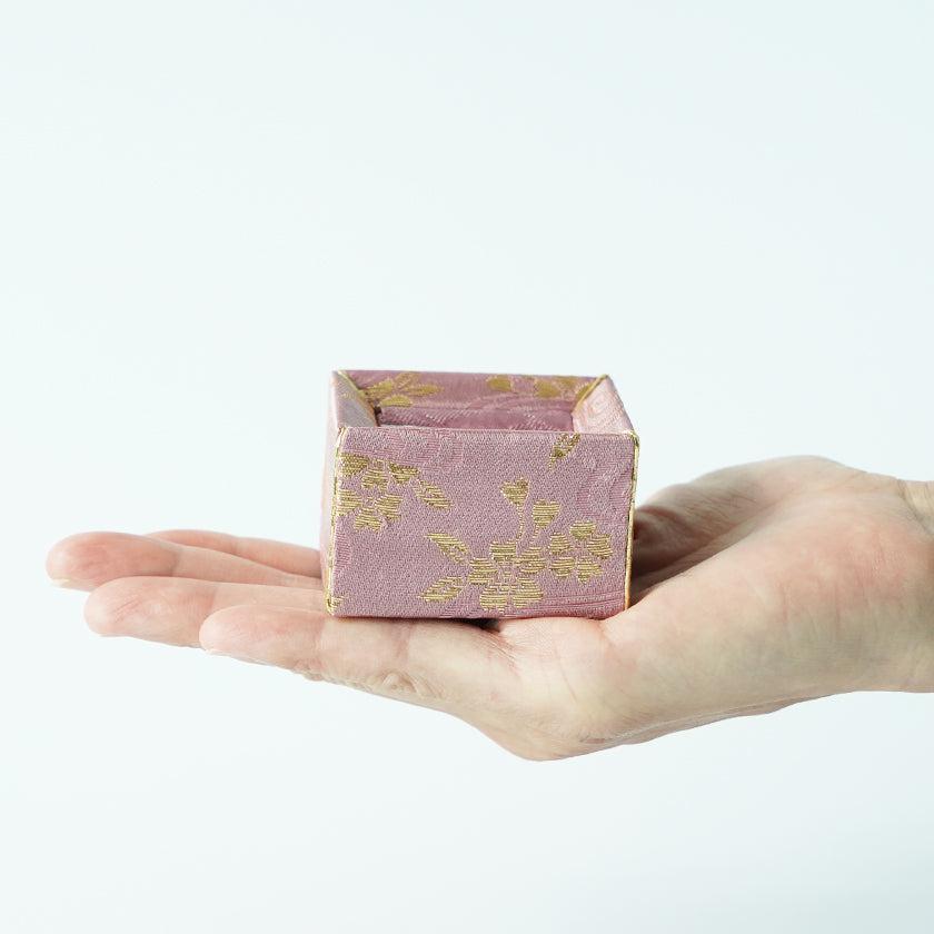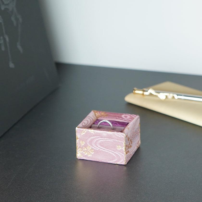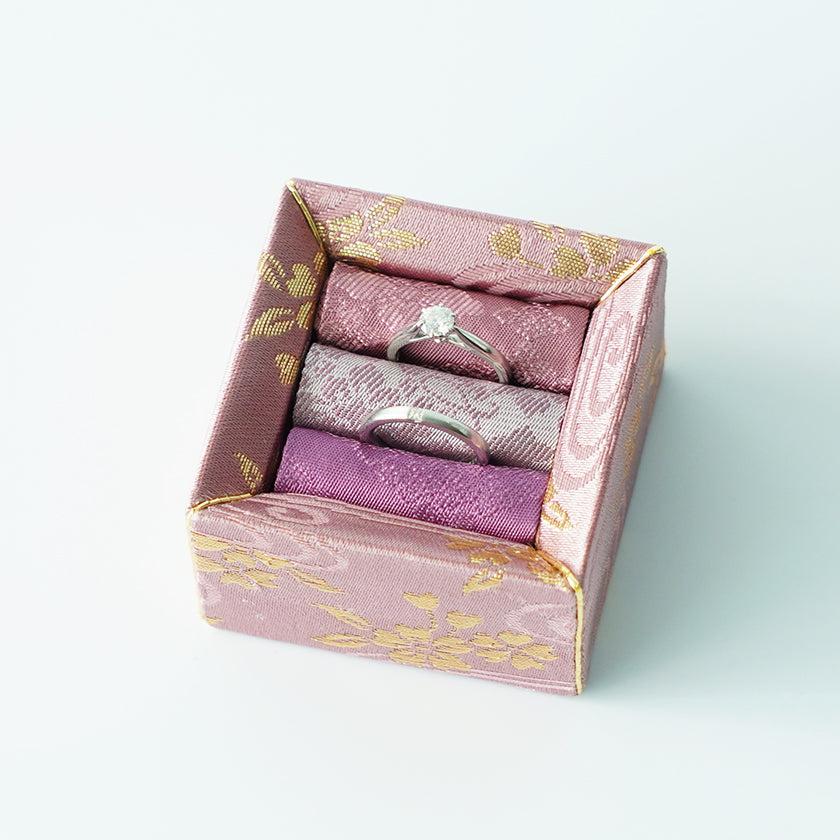 伝統的な雛人形にも使われる土台に筋を入れて布が動かないようにする“木目込み(きめこみ)”という技法を用いて作った指輪ケースです。