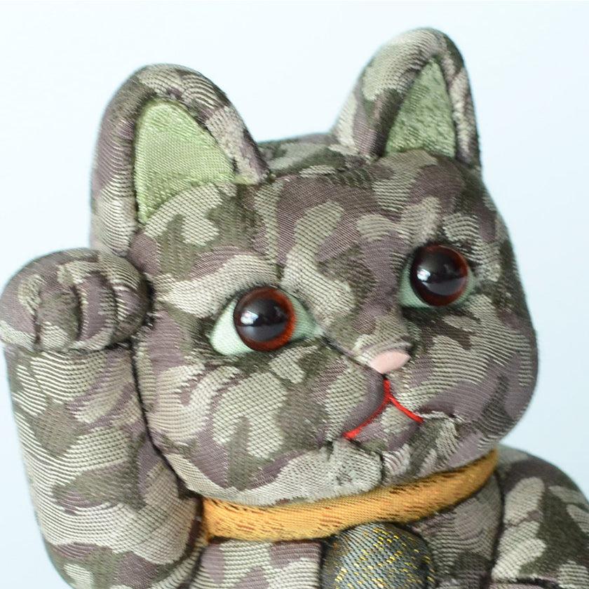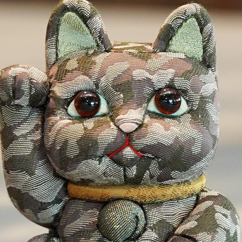 ユニークな迷彩柄が特徴の江戸木目込みの招き猫です。