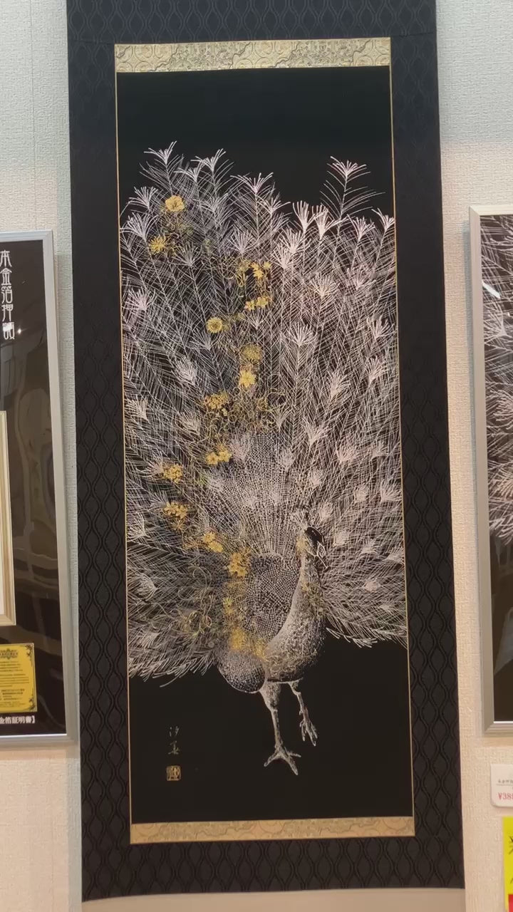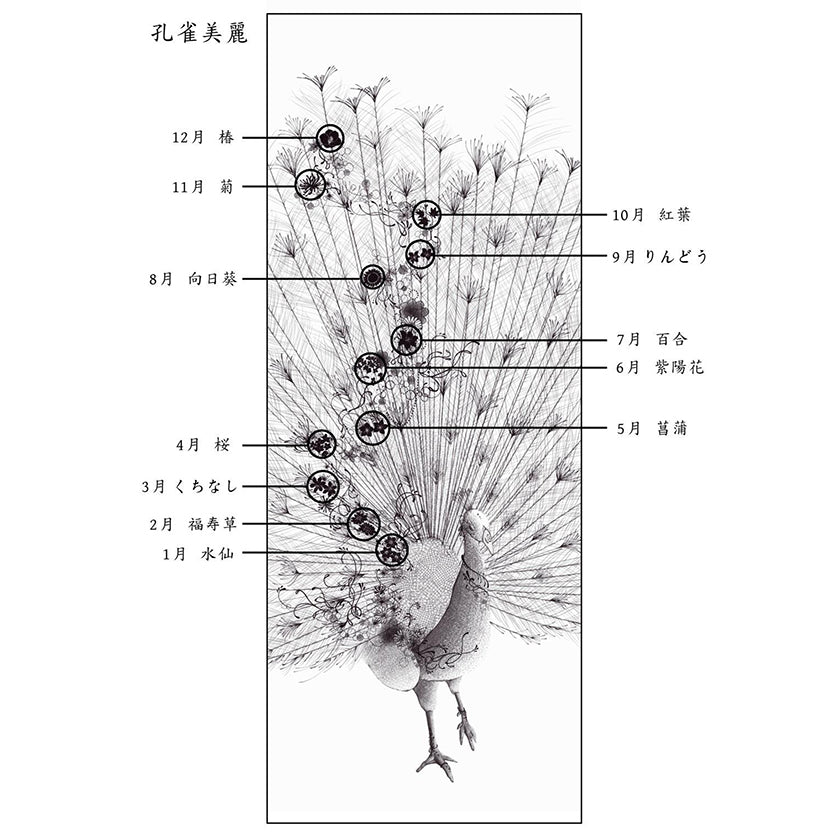 孔雀の羽の中には、12か月の誕生花を描き込み、本金箔の輝きと彩りが調和する華やかな掛け軸です。