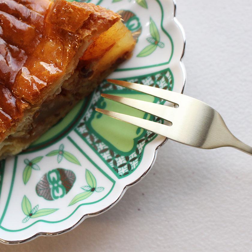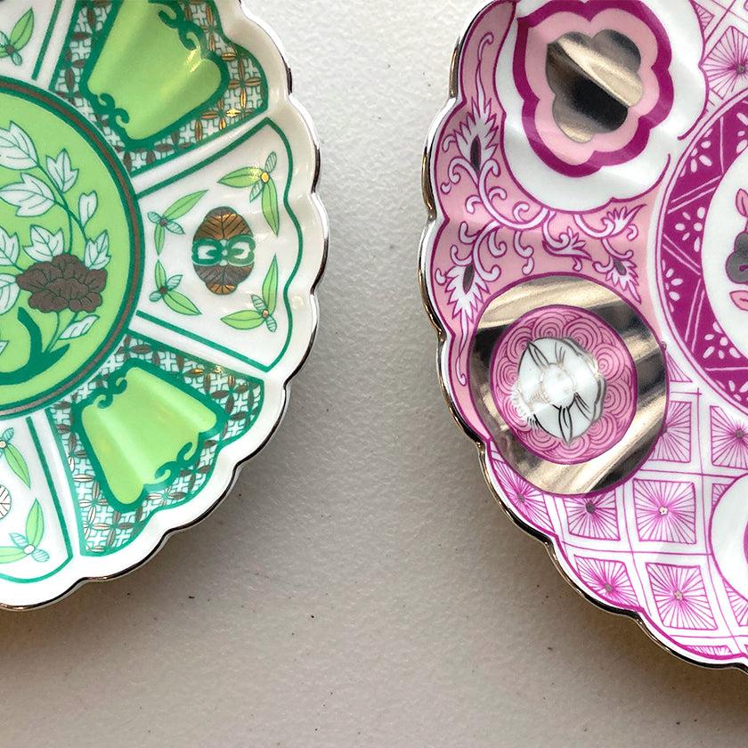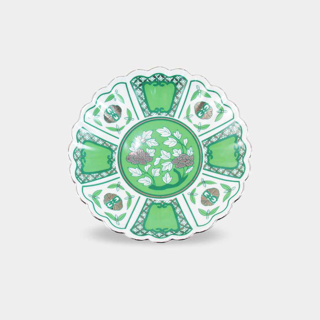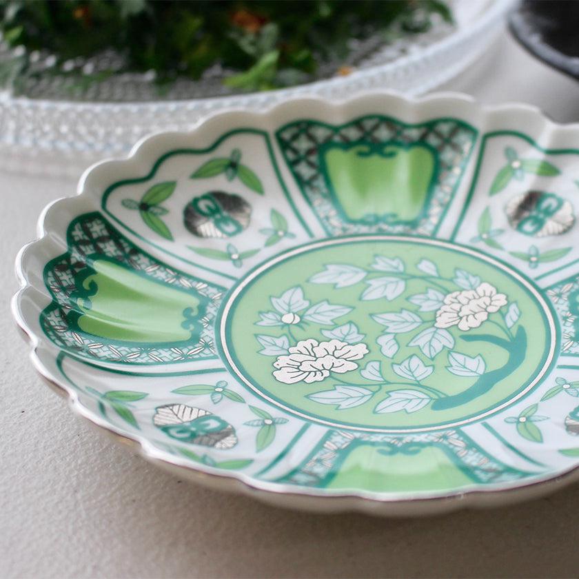 お皿の縁には銀彩が施され、全体のイメージをキリリと引き締めています。間近でみると、丁寧に絵付けされているのがよりわかりますね。卓越した技をもつ職人の手仕事が活かされたお皿です。すべての工程が手作業のため、同じお皿でも少しずつ風合いが異なる一点物であることも魅力のひとつです。