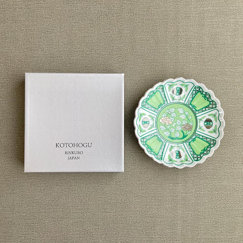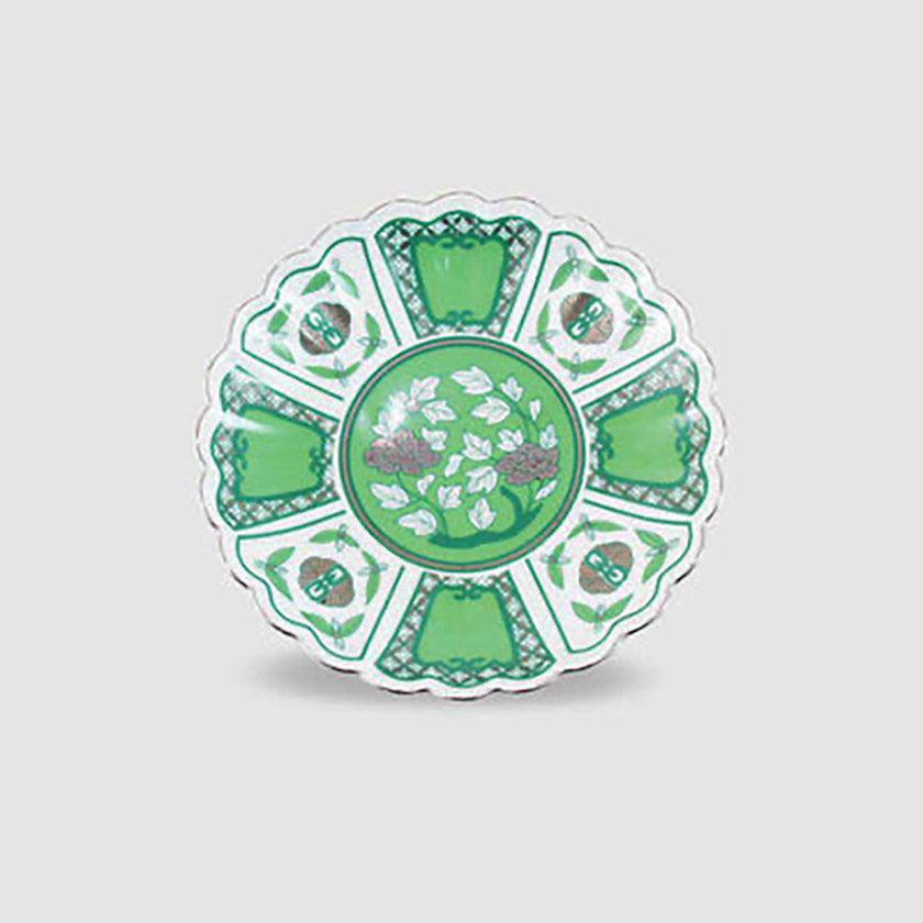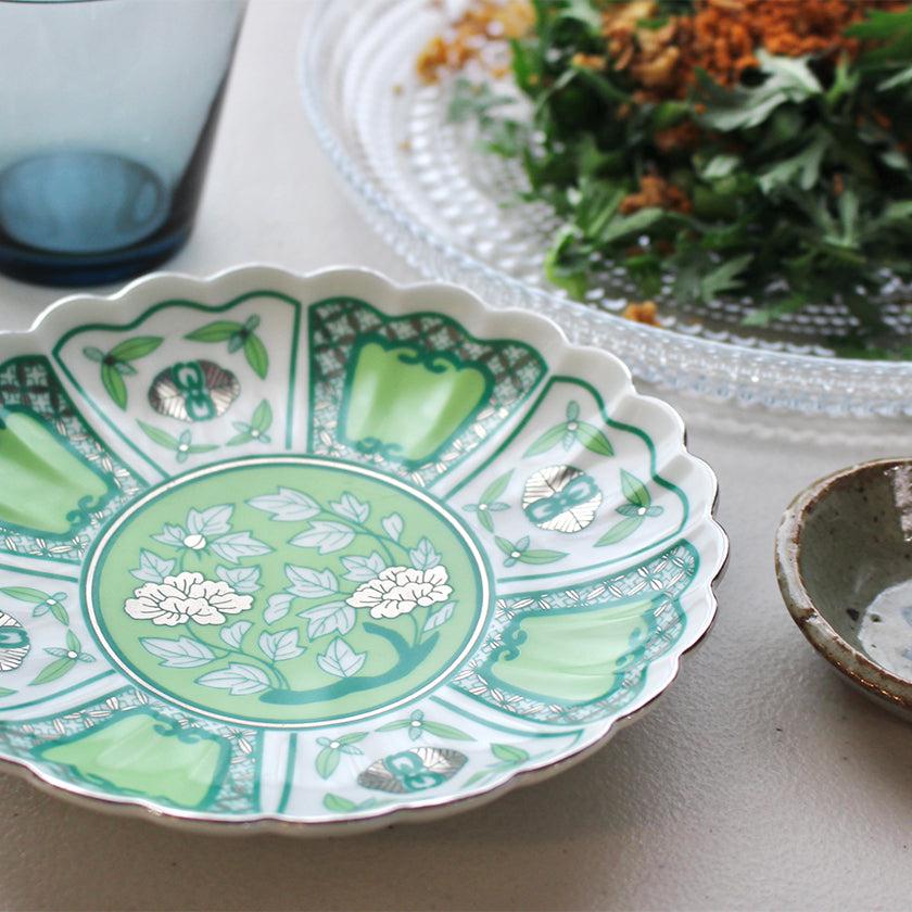 真っ白な磁器をベースに、濃淡の萌黄色・金色の絵柄が美しくお皿全体に広がっています。高級感はあるのに重々しくなく、どんな盛り付けにもあわせたいと思える使いやすさは、やはり豪華絢爛な古伊万里の様式が現代風にアレンジされているからこそ。