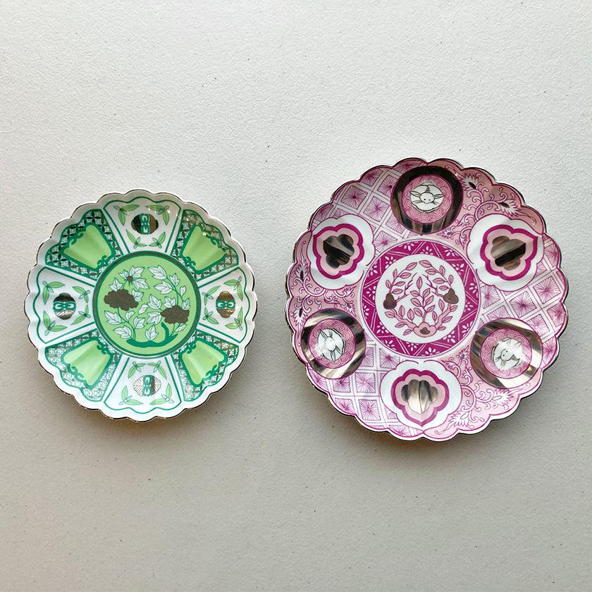 林九郎窯が手がけるプレートは、直径約15cmの「皐月」のほか、ひとまわり大きい直径18cmの「昴」もあります。主に盛り皿として使う場合には18cmを、取り皿や小皿としても使いたいなら15cmを選ぶのがおすすめ。皐月と昴ではお皿に描かれている絵柄も異なるので、お好みで選ぶのもいいですね。