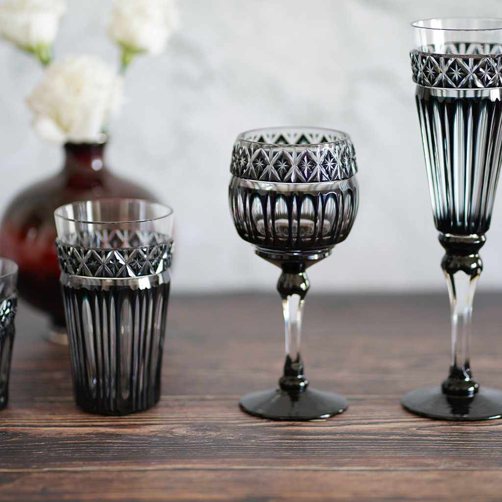 グラスのボウル部分の繊細なカッティングは見とれるほどに美しく、やさしい曲線を描くステムもエレガント。フットに施された黒色も全体を引き締めてくれて、とてもモダンな印象です。