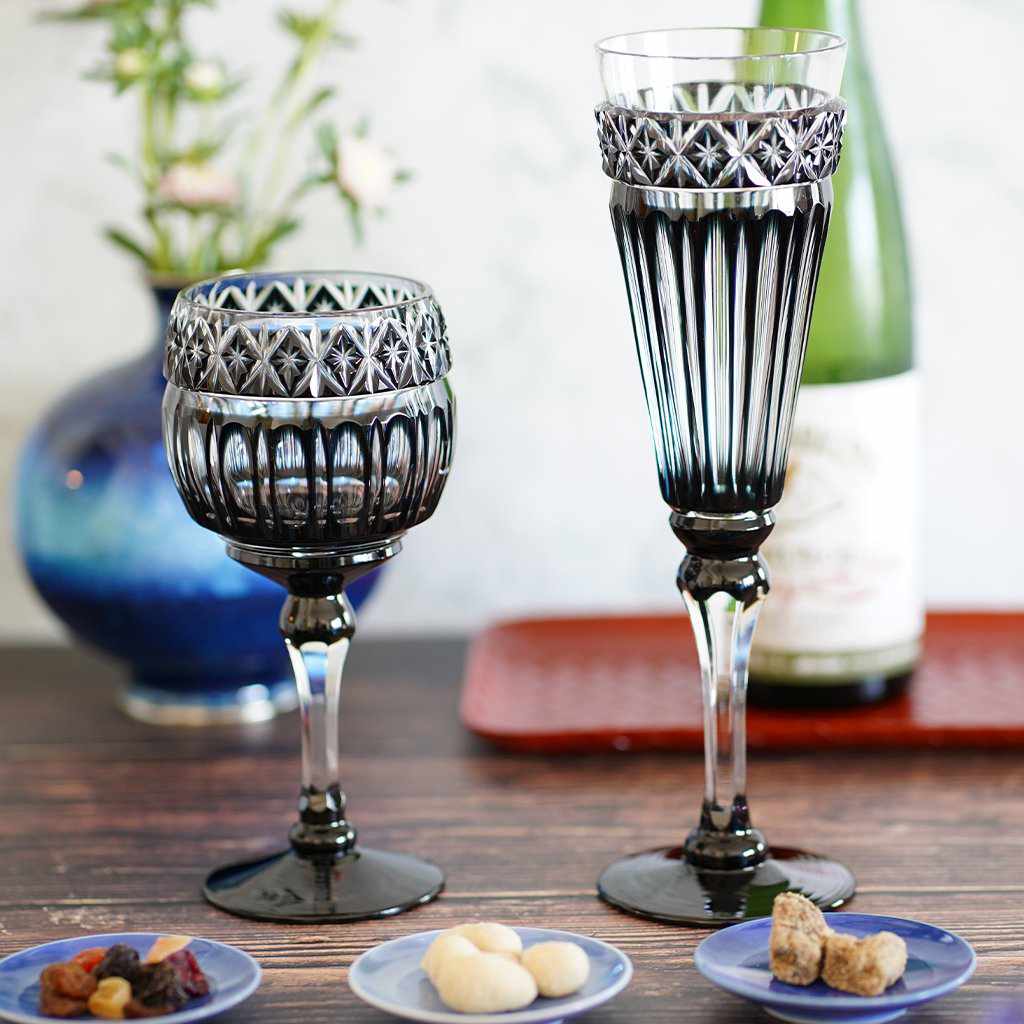 現代のスタイルとして、新たに生み出された薩摩黒切子のワイングラスです。