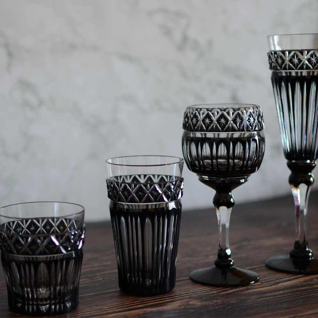 このワイングラスに使われているのは、シックなブラックカラー。このグラスを手がけている薩摩びーどろ工芸が、2006年に業界で初めて黒色の発色に成功しました。光を通さない黒色のガラスのカッティングは、長年の経験と勘が必要な高度な技術。制作にも通常の2?3倍の時間かかる手の込んだ逸品です。