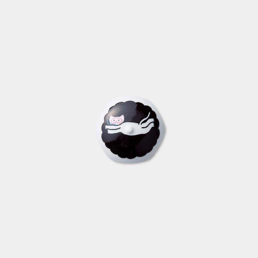 約30度のお湯がかかると、モノトーンの海を泳ぐねこのまわりに鮮やかな魚が現れる楽しい排水口カバーです。