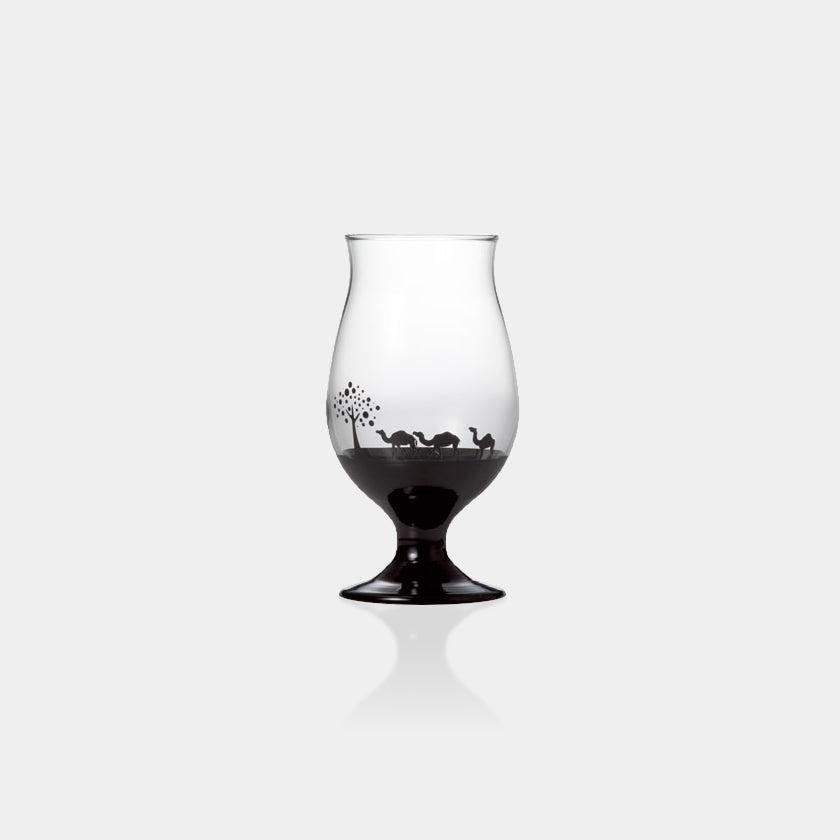 砂漠を歩くラクダを描いた丸みのあるビアグラスです。
