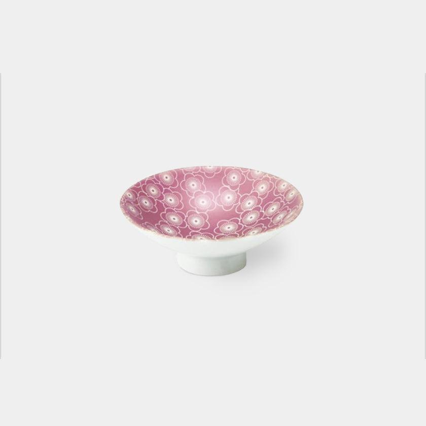 日本の伝統的な吉祥文様を、スモーキーなピンクで描いた雰囲気のある平盃です。