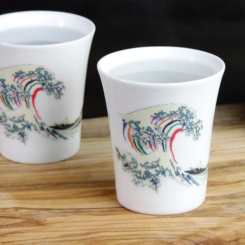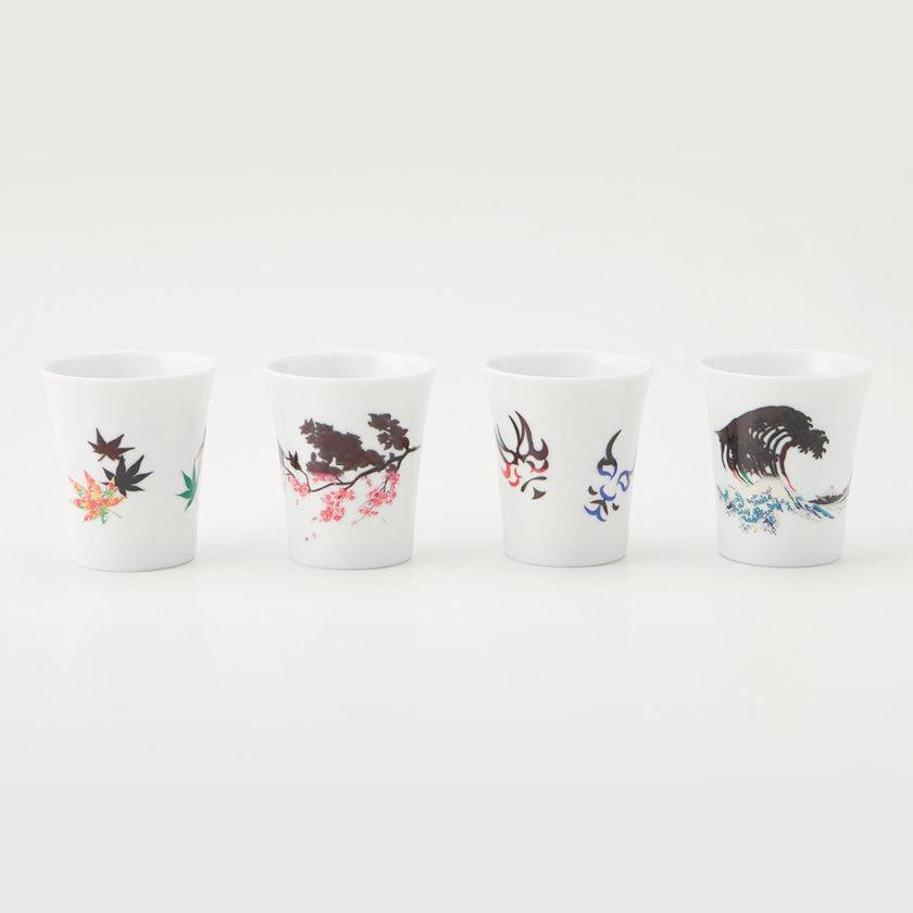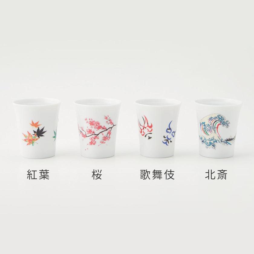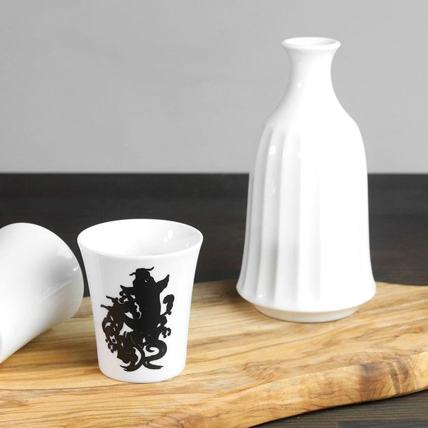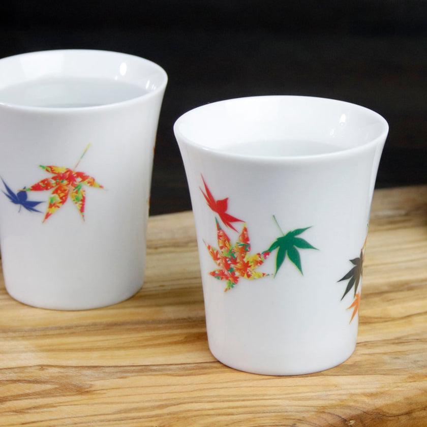 約45度以上の熱燗や温飲料を入れると、黒いシルエットから鮮やかなモチーフが現れる温感シリーズのカップ (小) です。
