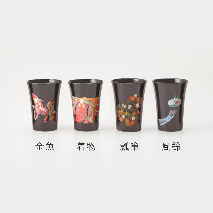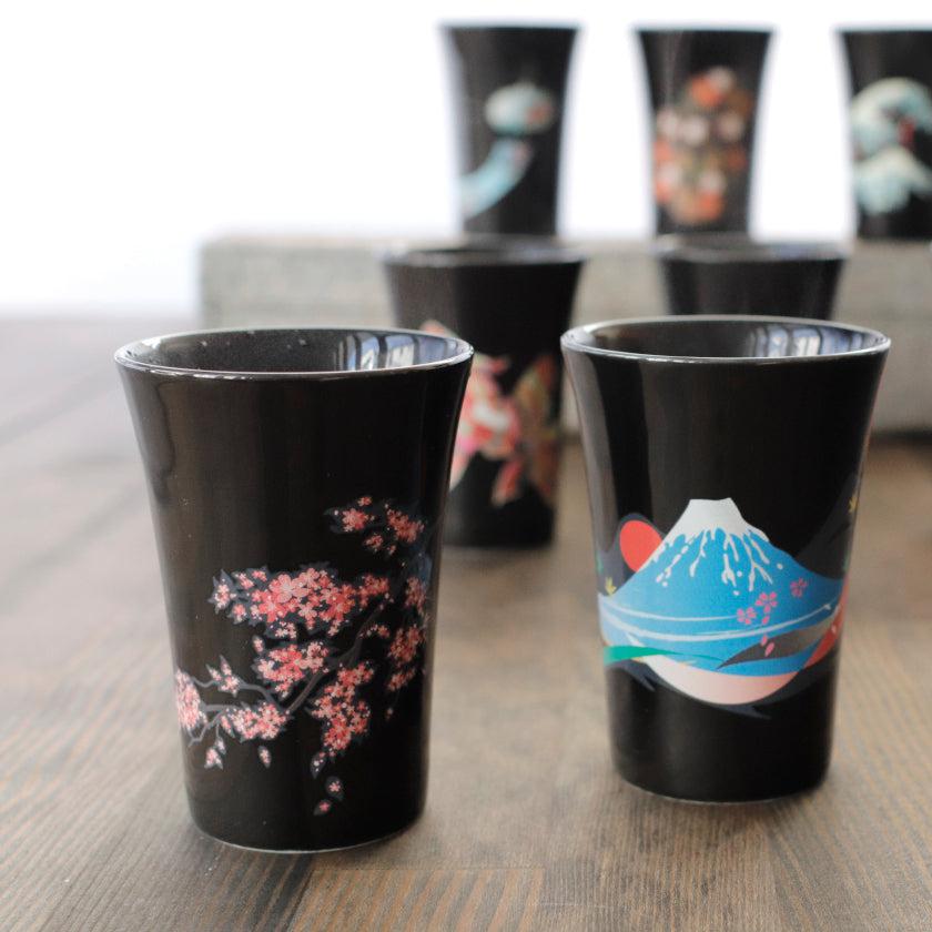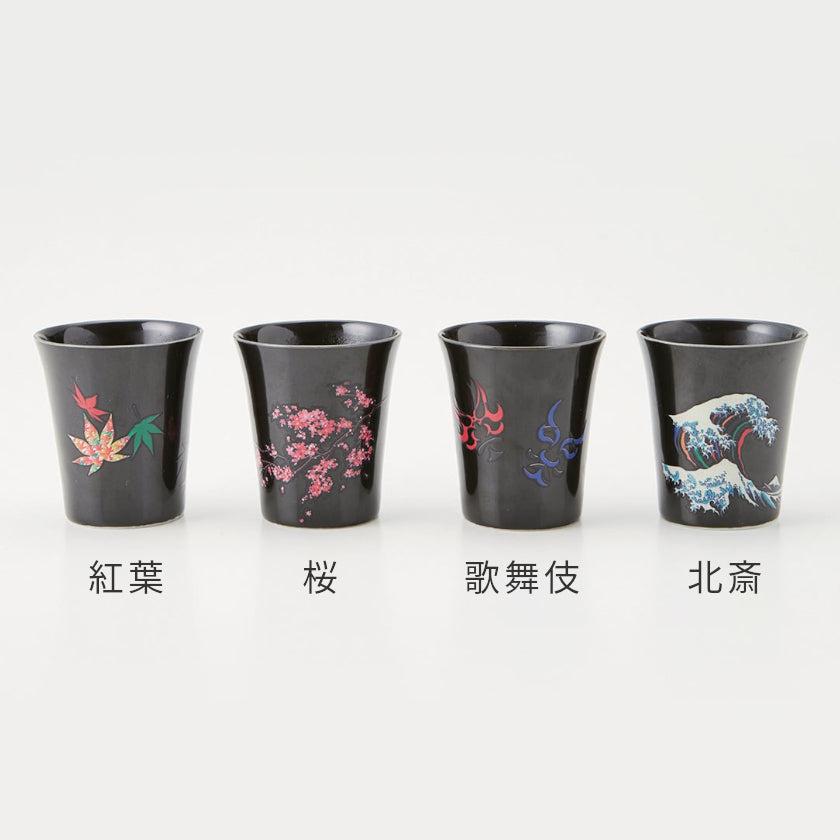 約45度以上の熱燗や温飲料を入れると、黒いシルエットから鮮やかなモチーフが現れる温感シリーズのカップ (中) です。