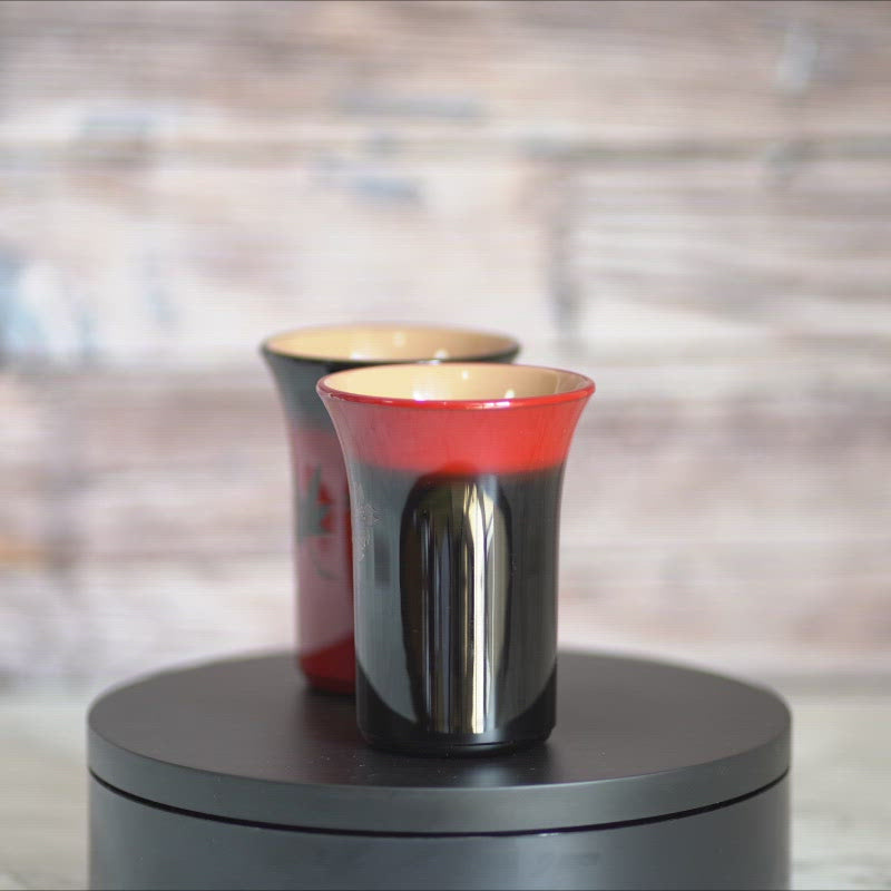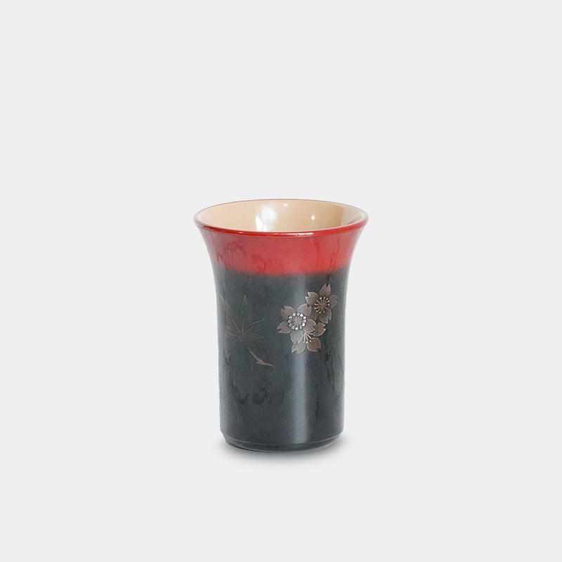 塗り上げたぼかしカップに、銀粉青貝で桜を緑乾漆で紅葉を表現しました。