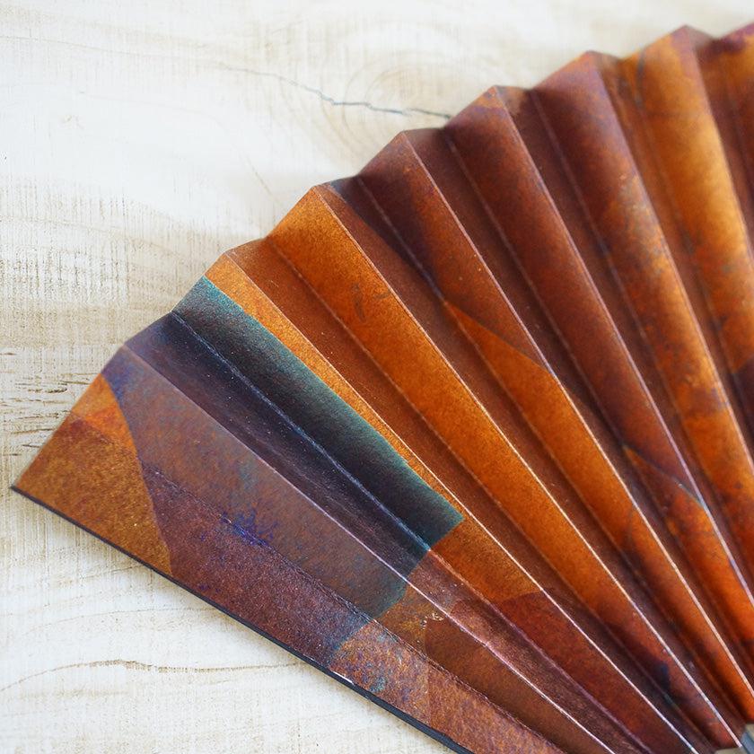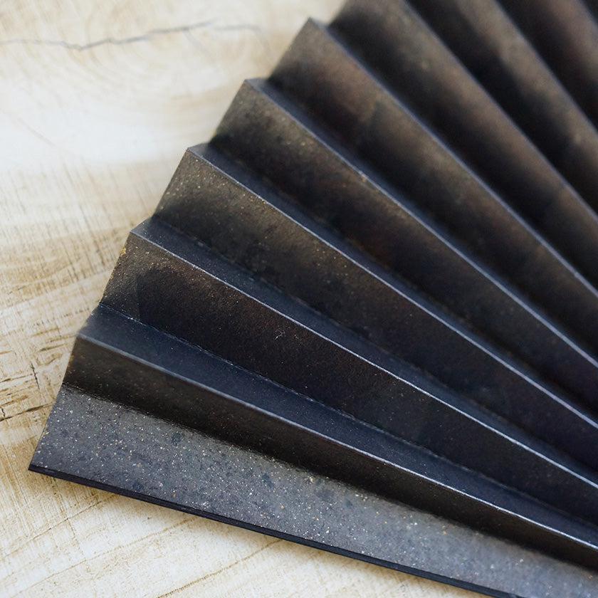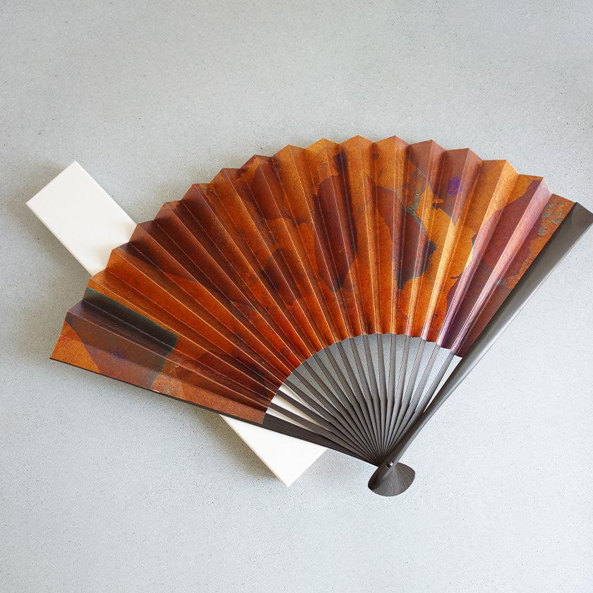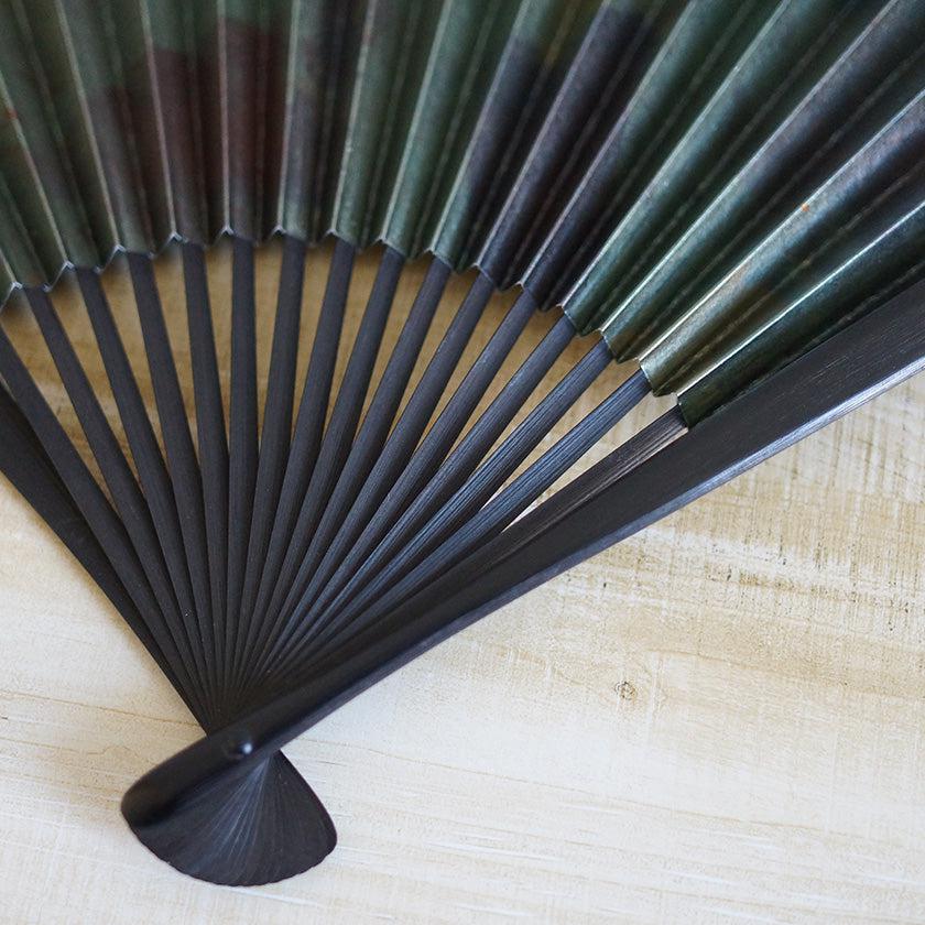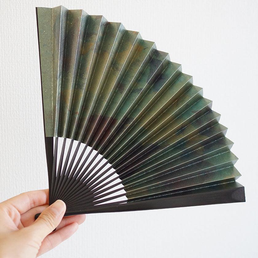 この燻シリーズで使用している扇の箔は、慣用句の「燻銀」の語源となっている、銀の化学変化をエイジング加工で再現し、素材の特徴を活かした発色方法で作られています。