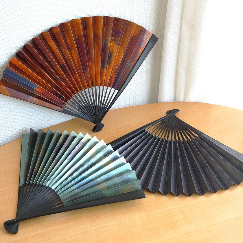 こちらの扇子は、どれも味わい深い3色のカラー展開。銀を硫黄で燻し最終的に黒へ向かっていく過程で現れる色味と、熟成しきった燻銀の色味を楽しむことができます。