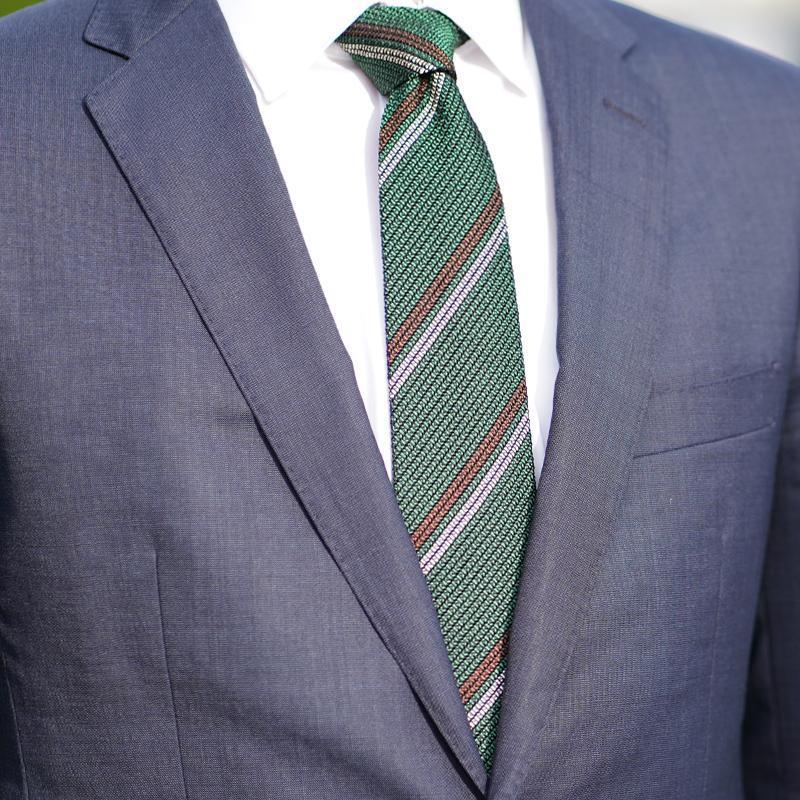 シンプルなフレスコベースの織りに、2本のラインが存在感を発揮するストライプタイです。その品質は英国王室御用達のテーラーにも認められ、世界から高い評価を得ています。