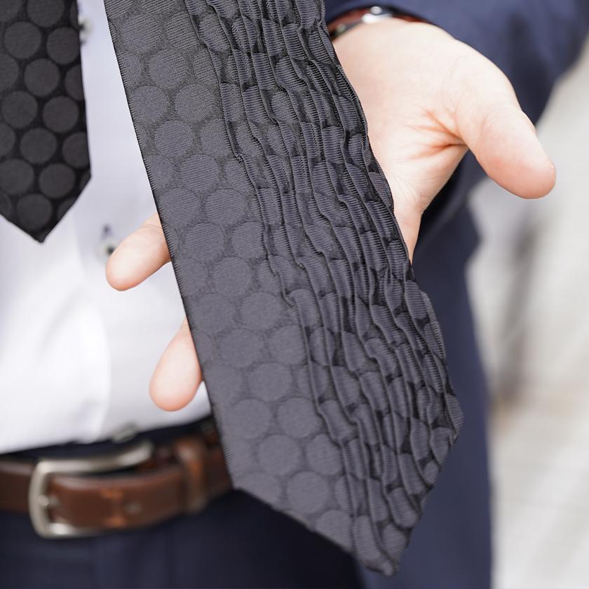 京都の伝統工芸「西陣織」とプリーツ技術を融合し、とても締めやすく皺になりにくい独自技術のネクタイが誕生しました。