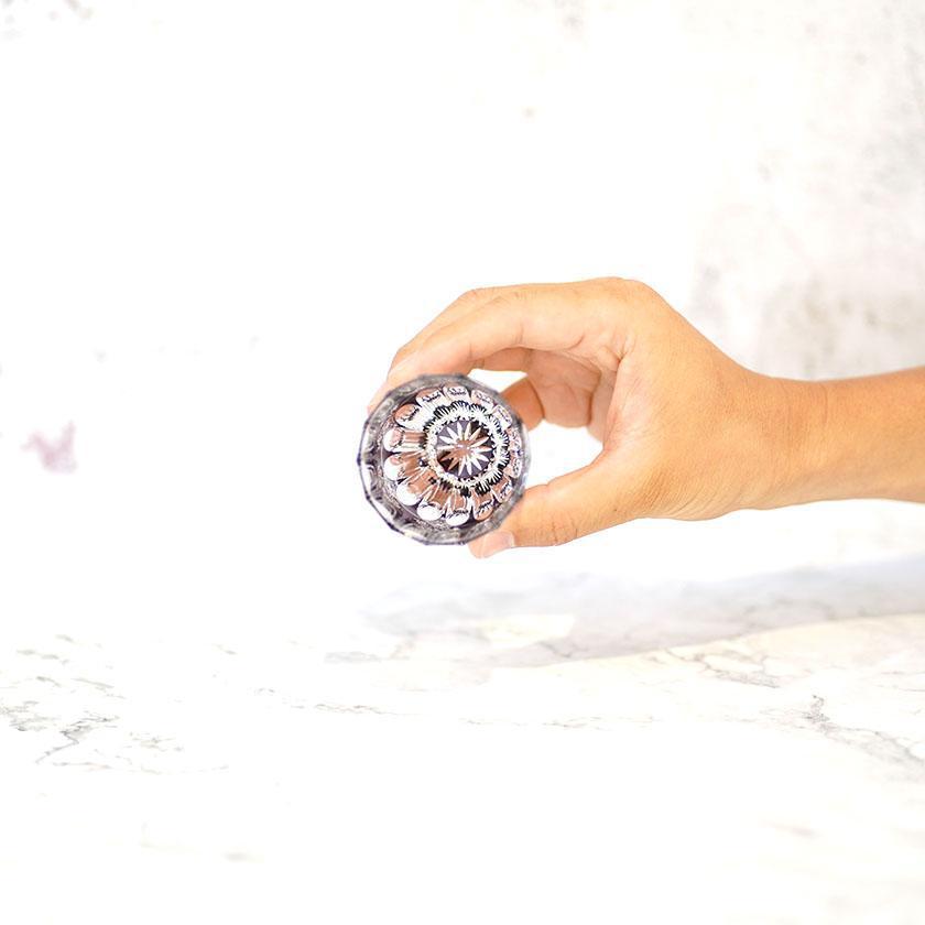 液体を注ぐことで上部の磨きにも反射の効果が加わり、万華鏡のような様相を見せ、切子の花が鮮やかに咲き乱れます。