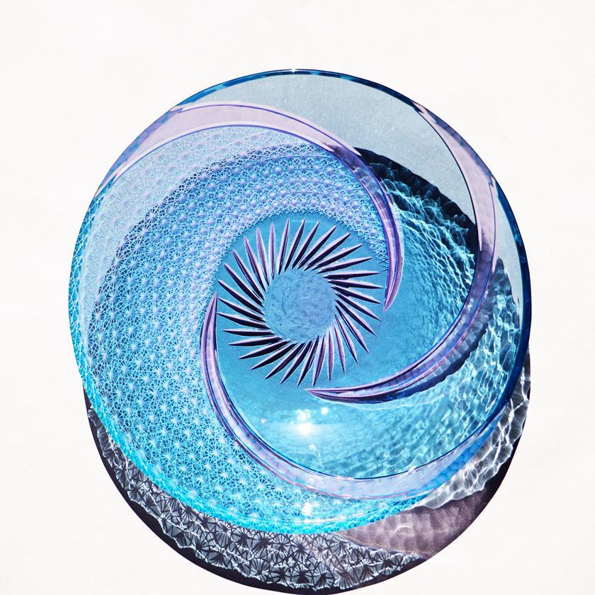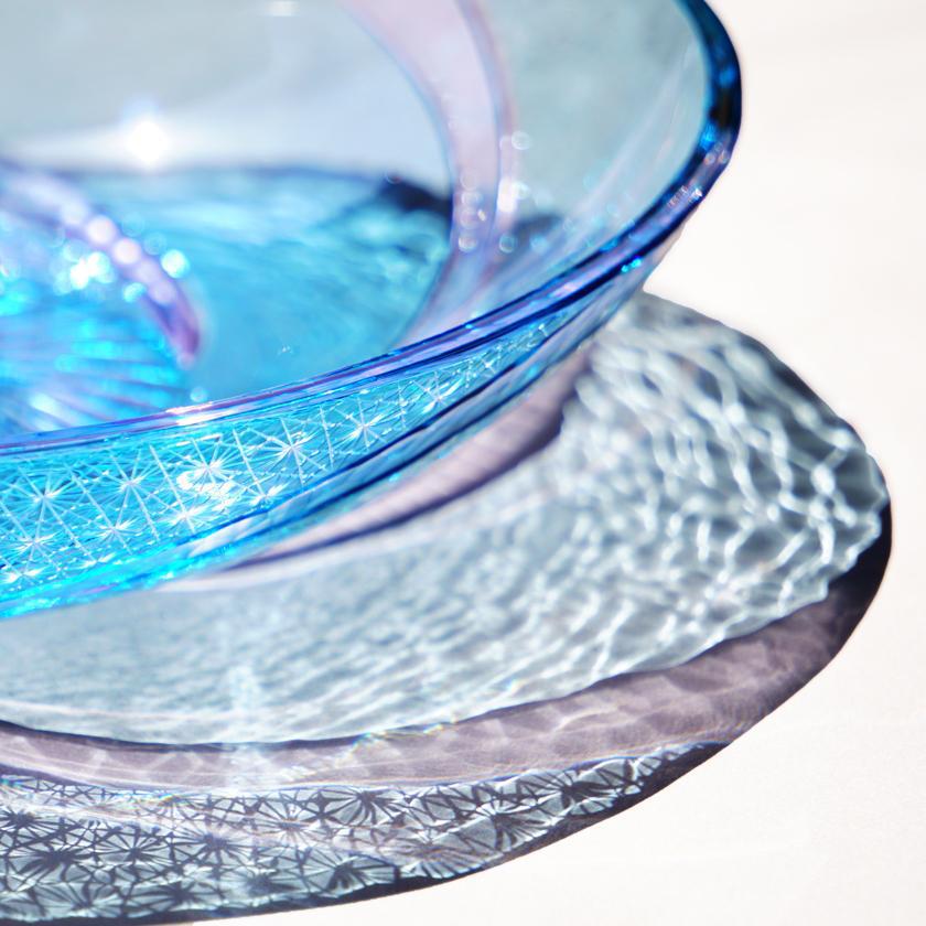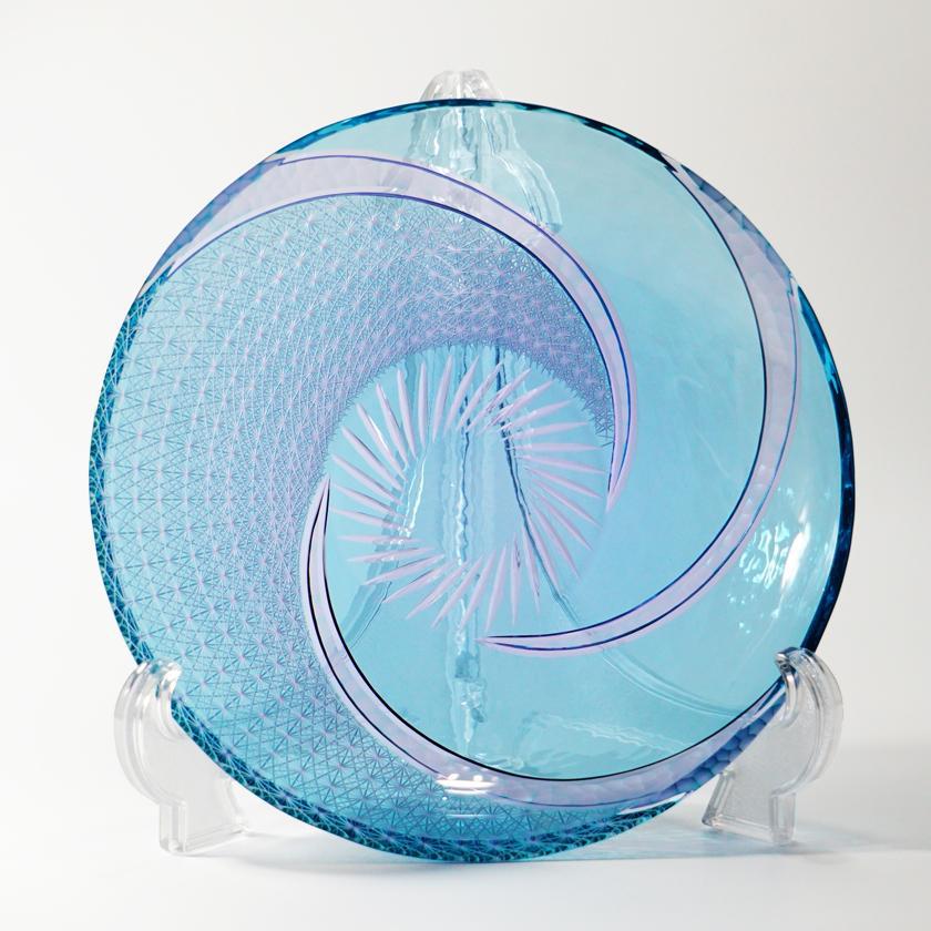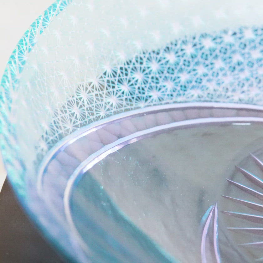 グリーン とネオジウムの爽やかな色合いのガラスへ、大胆に菊つなぎを施したお皿です。