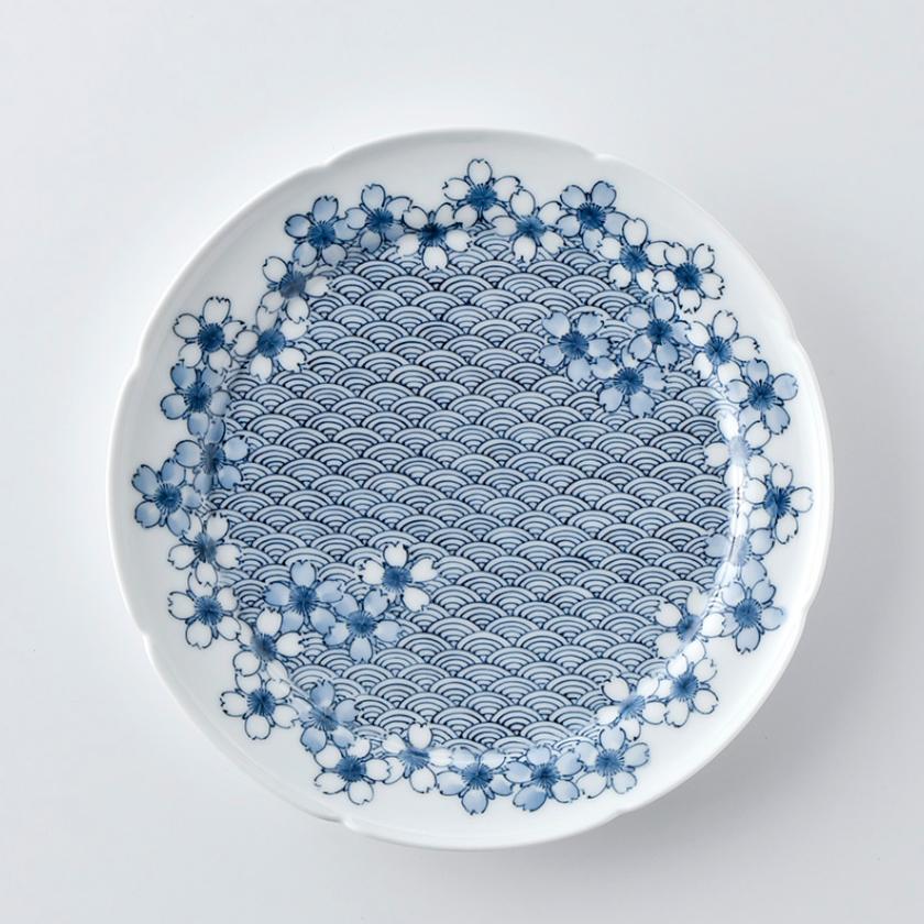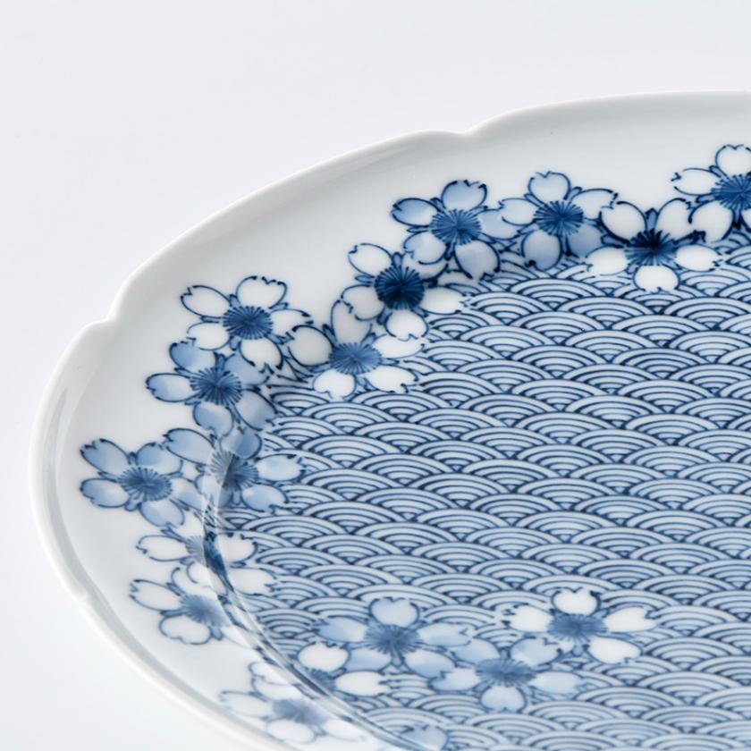 輪花形の23cmの浅い皿に青海波と桜の花の濃淡で、立体感や瑞々しさを表現しました。