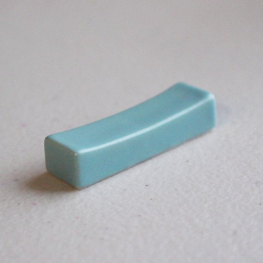 若狭塗箸とセットになっているのは、長崎県で生産されている陶磁器、波佐見焼の箸置き。若狭塗箸のブルーのラインとシンクロするような、爽やかなパステル調のブルーが食卓を明るくします。