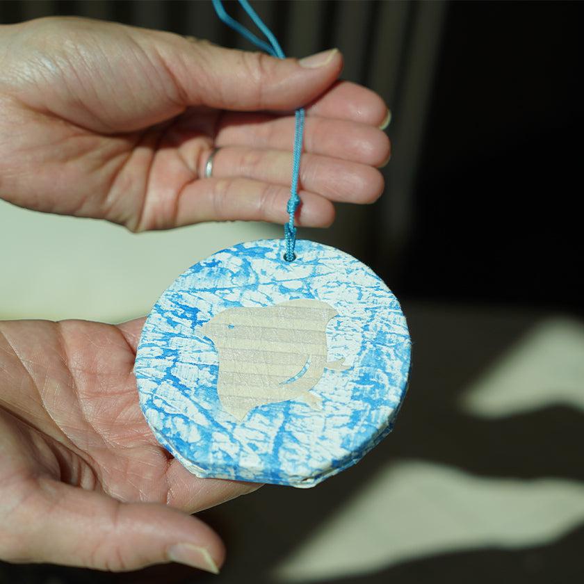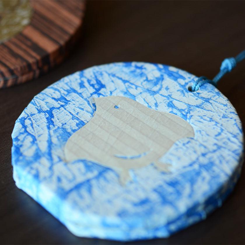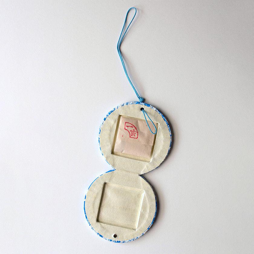和紙に刷毛で波の色を引き、吉祥文様の浜千鳥を描いています。波のかすれや濃淡が味わい深い、すべて手作りの香り入れです。