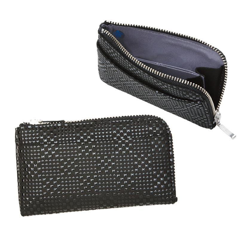 黒地に黒漆で模様を施したL字ファスナー式小銭入れは、中に仕切り、外側にもポケットを備えているので、小銭や折りたたんだ紙幣、カード類もスマートに整理できます。