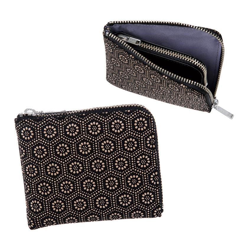 黒地に色漆で模様を施したL字ファスナー式小銭入れは、中に仕切り兼用のL字ファスナー式ポケットを備えており、小銭・紙幣・カード類を分けて整理できて、ひと目で中身を確認しやすいデザインです。