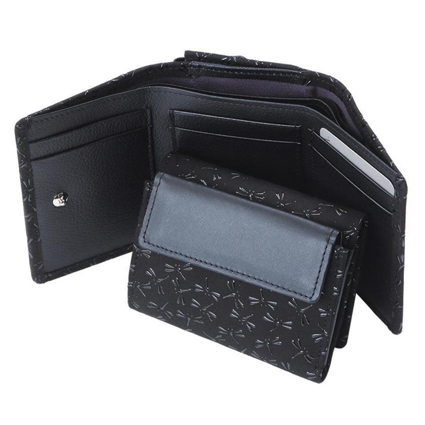黒地に黒漆で模様を施した三つ折り財布は、札入れ×2、カード入れ×6、背面にホック留めの小銭入れを備えた整理しやすいデザインです。