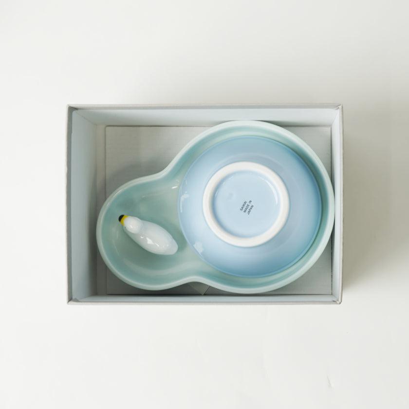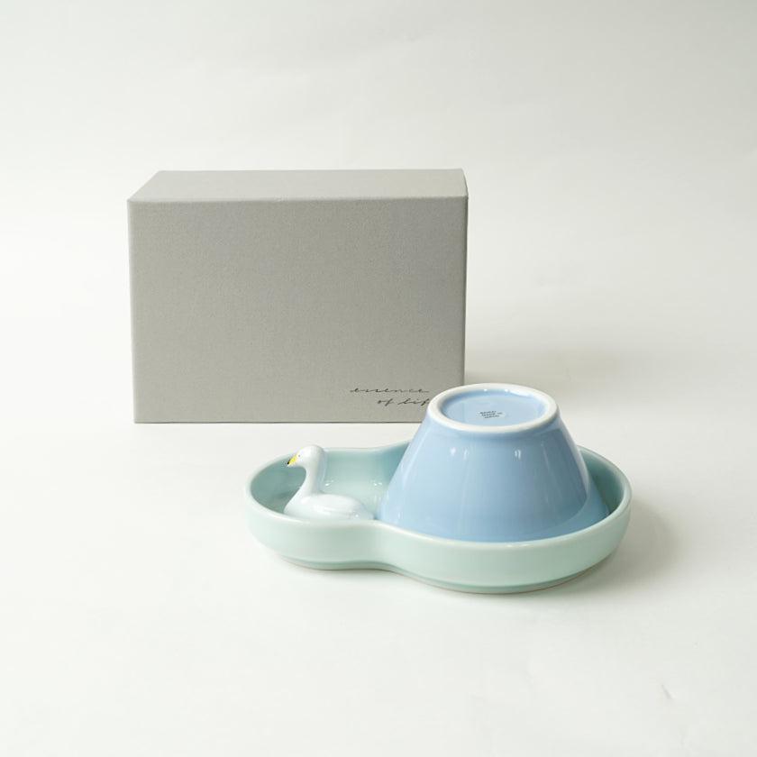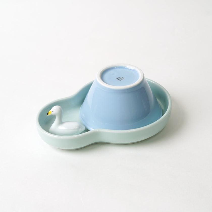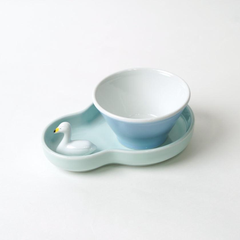 パステルブルーのひょうたん型プレートと山型ボウル、スワンの箸置きがひとつになったキッズセットです。