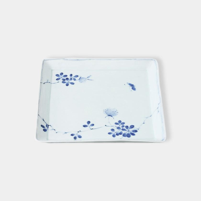 波佐見焼特有の輝くような白磁に、藍色の絵付けで野原の風景を繊細に描いた「野原」シリーズの角大皿です。