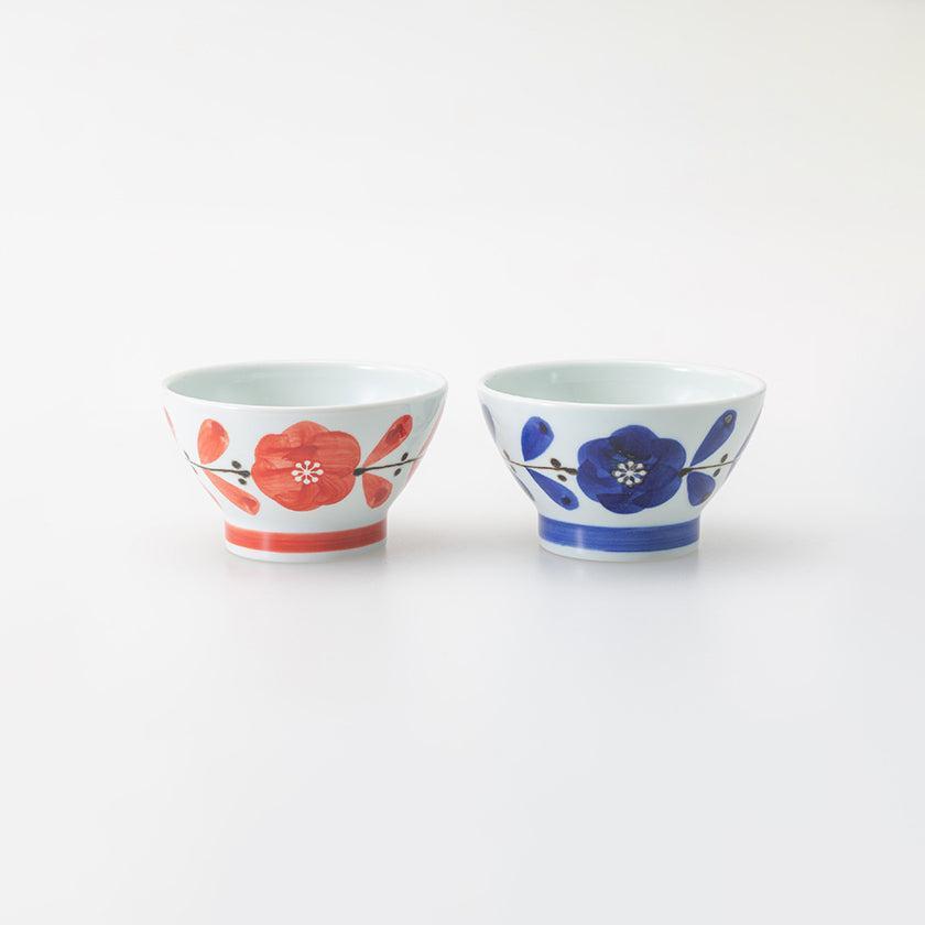 シンプルな大きな花柄が魅力の、ペアのお茶碗。高台が大きく安定しているのが特徴です。