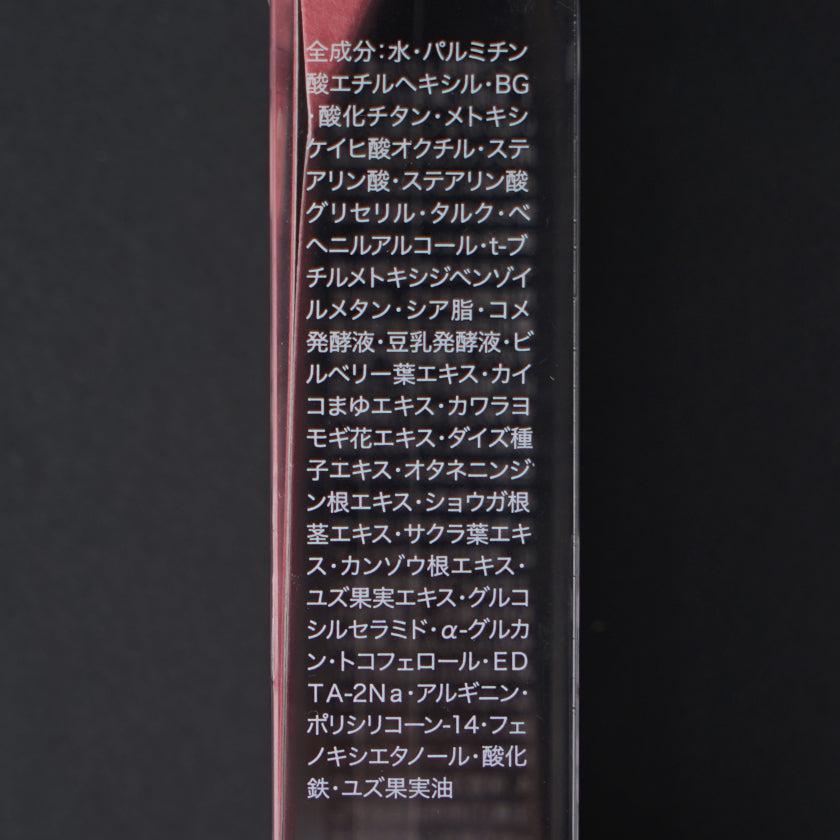 | 素材 | 水、パルミチン酸エチルヘキシル、BG、酸化チタン、メトキシケイヒ酸オクチル、ステアリン酸、ステアリン酸グリセリル、タルク、ベヘニルアルコール、t-ブチルメトキシジベンゾイルメタン、シア脂、コメ発酵液、豆乳発酵液、ビルベリー葉エキス、カイコまゆエキス、カワラヨモギ花エキス、ダイズ種子エキス、オタネニンジン根エキス、ショウガ根茎エキス、サクラ葉エキス、カンゾウ根エキス、ユズ果実エキス、グルコシルセラミド、α-グルカン、トコフェロール、EDTA-2Na、アルギニン、ポリシリコーン-14、フェノキシエタノール、酸化鉄、ユズ果実油 |