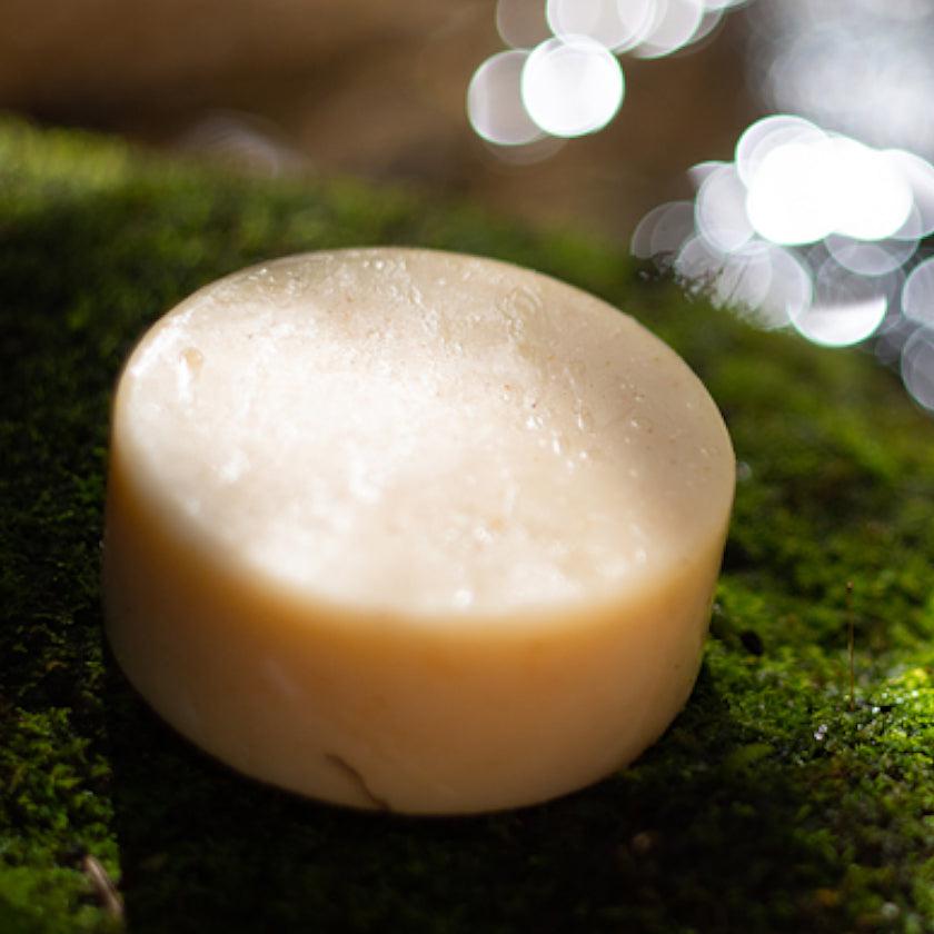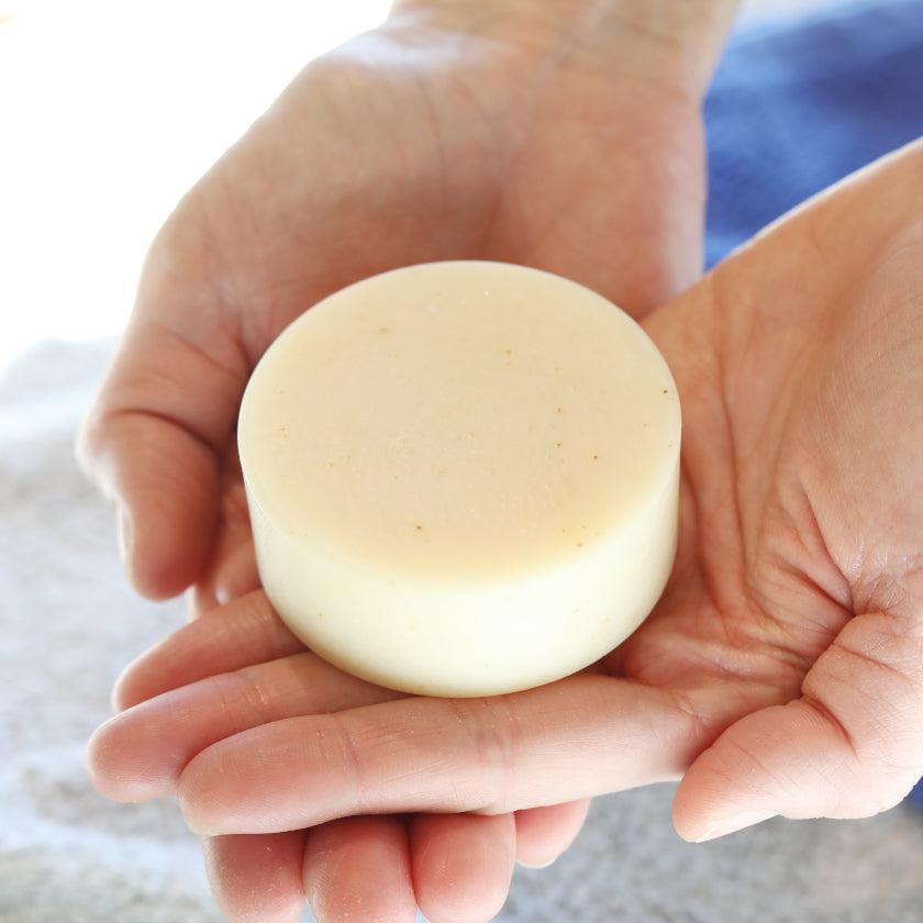 石鹸そのものは少し生成りがかった色味。自然そのものの素材が使われているため、茶色のつぶつぶも感じられます。美容成分たっぷりで肌にもやさしいため、デリケート肌の人でも使えるのがうれしいですね。