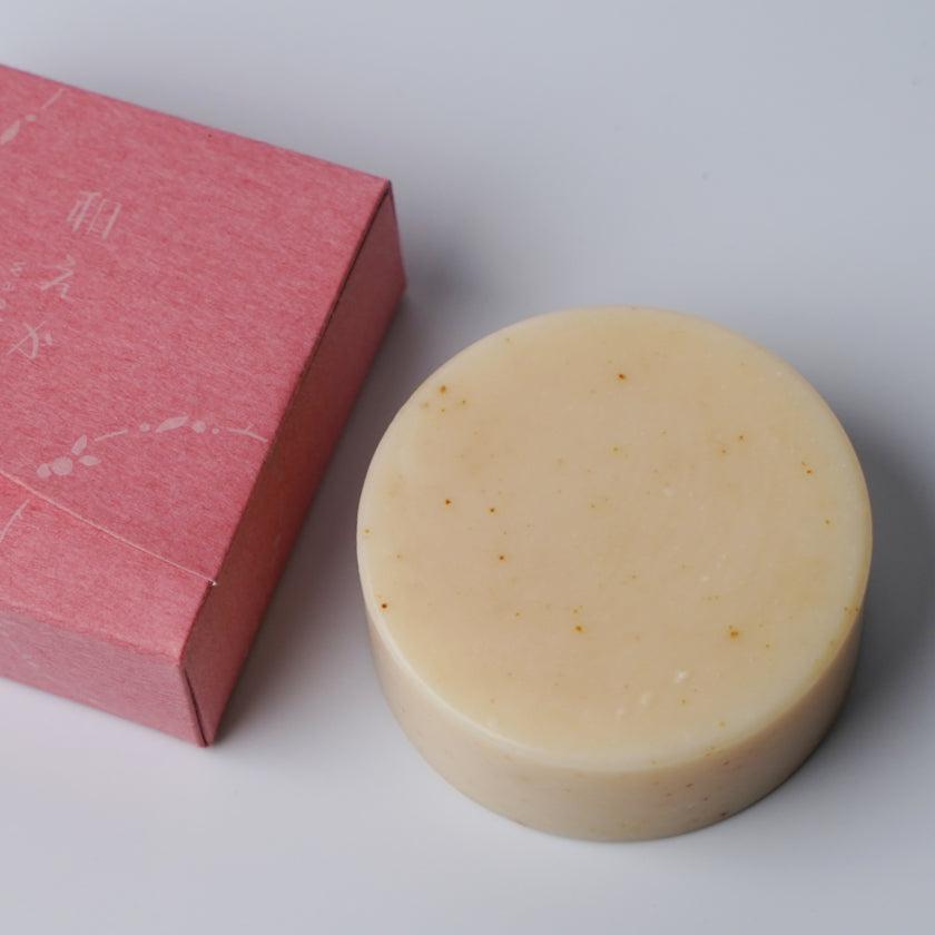 植物由来の優しい成分を使ったスキンケアシリーズ、「和えか」の石鹸。合成界面活性剤・合成保存料・防腐剤・発泡剤・鉱物油は不使用で、91%が天然由来成分です。