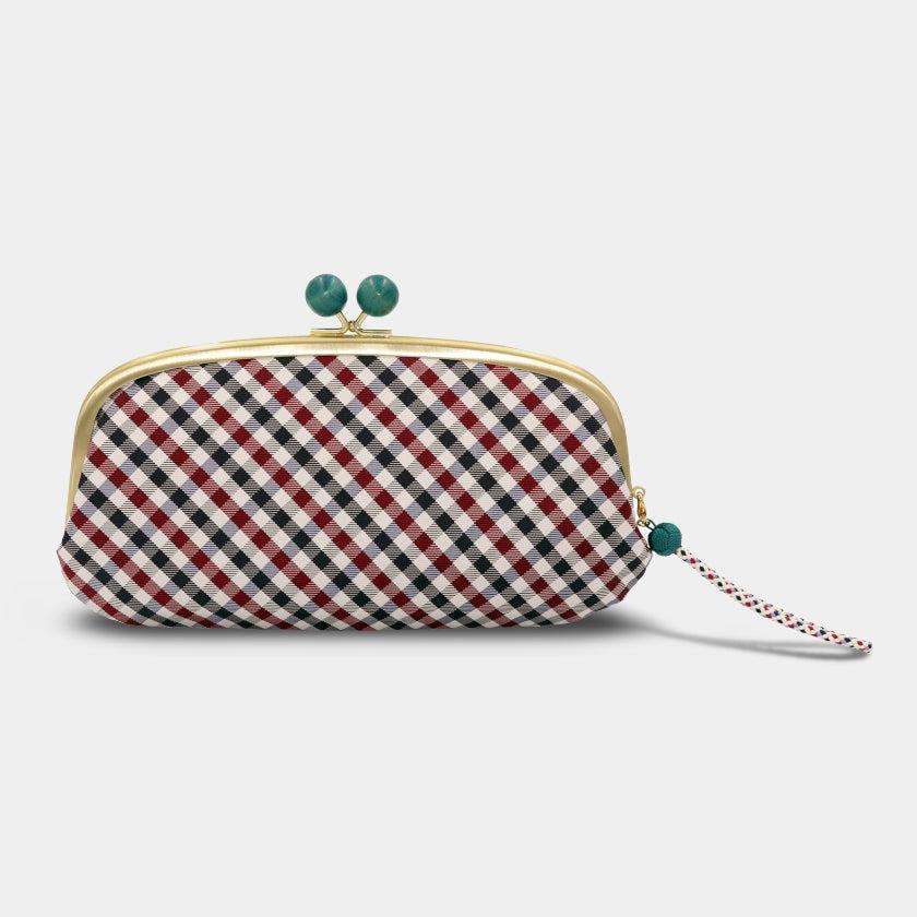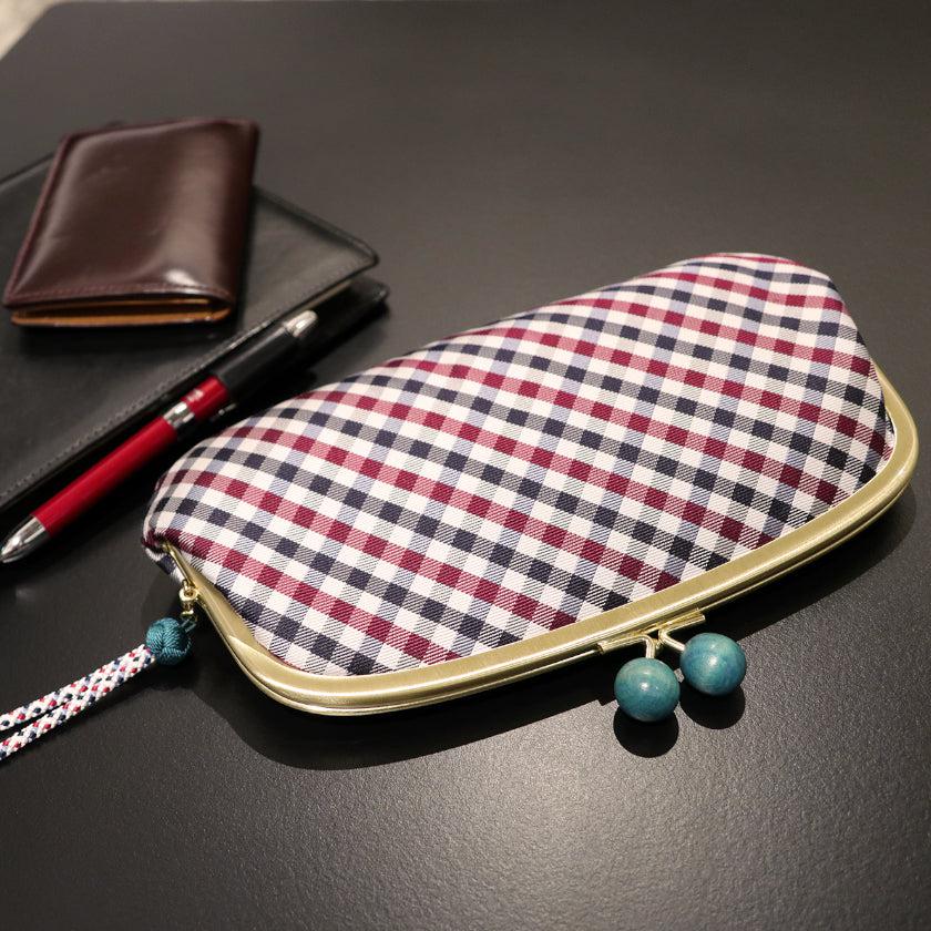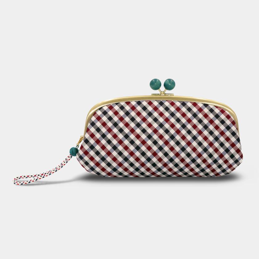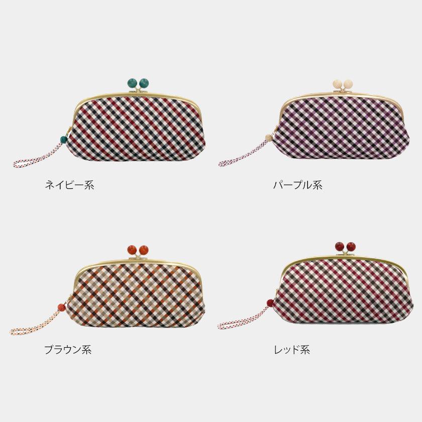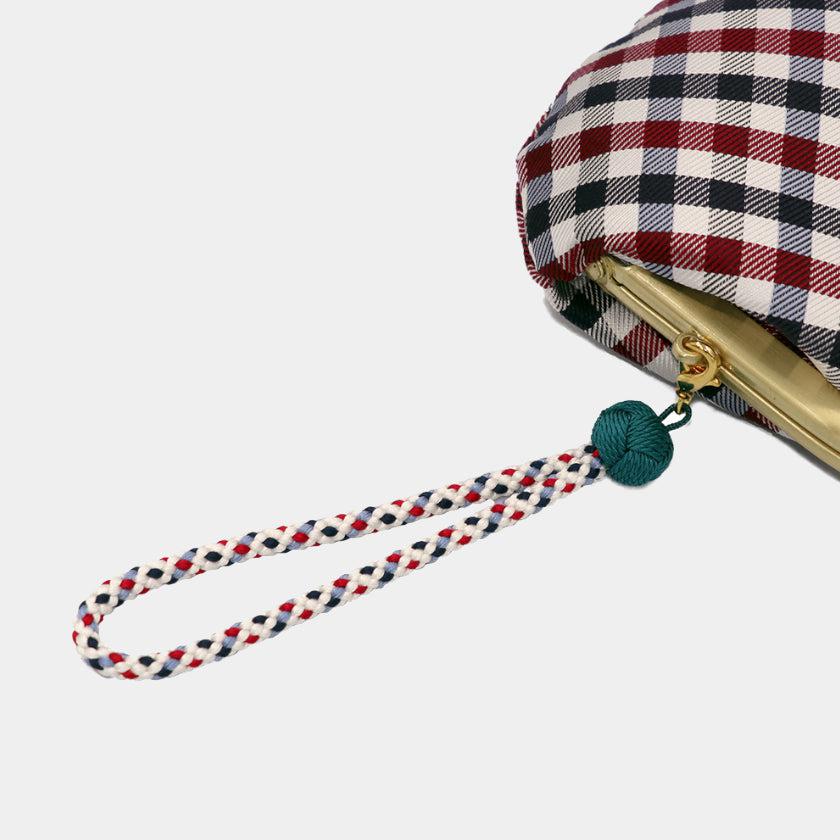上品なネイビーを中心としたギンガムチェックとストラップ、がま口の木玉の配色が絶妙にオシャレです。