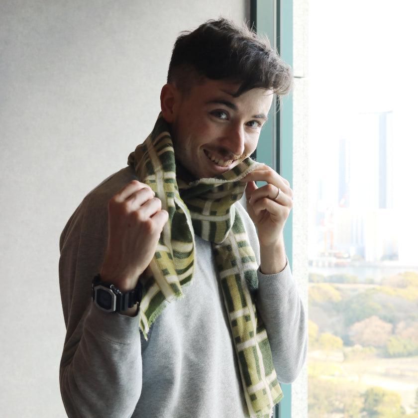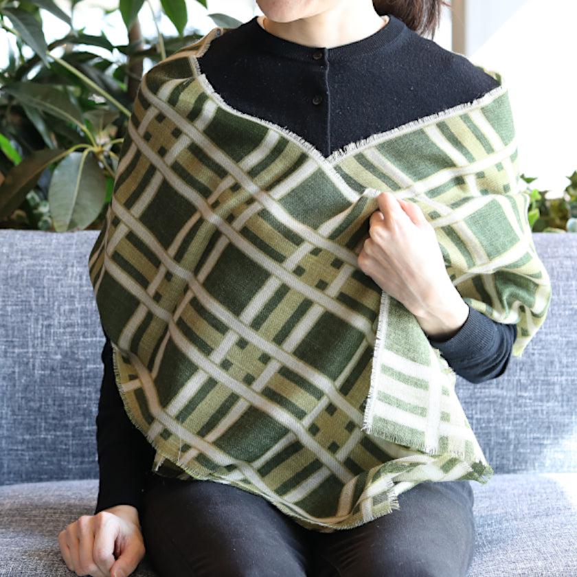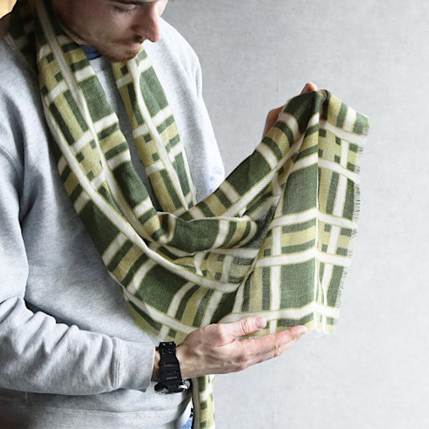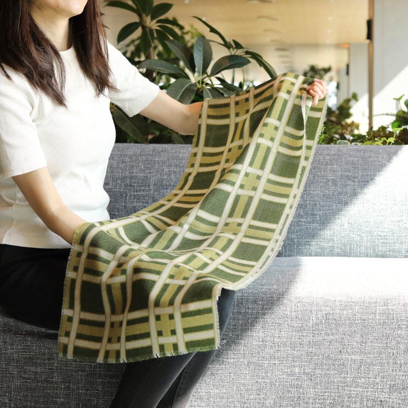 日本の伝統文様である格子柄を、天然ウールの生地にグリーンの濃淡で描き、落ち着きのある印象に仕上げました。