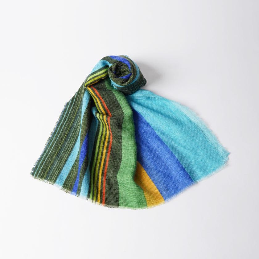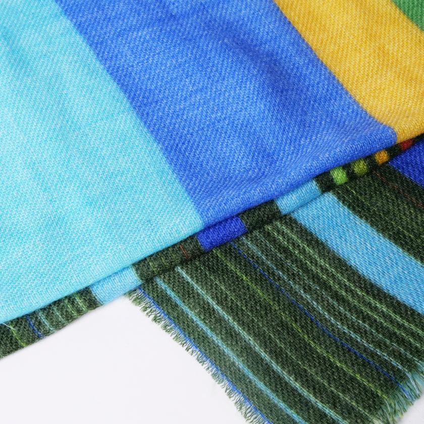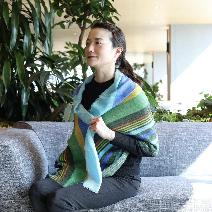 日本の伝統文様である追いかけ縞柄を、天然ウールの生地に青や緑など多彩色で描き、洗練された印象に仕上げました。