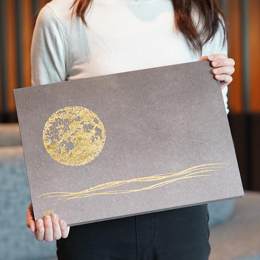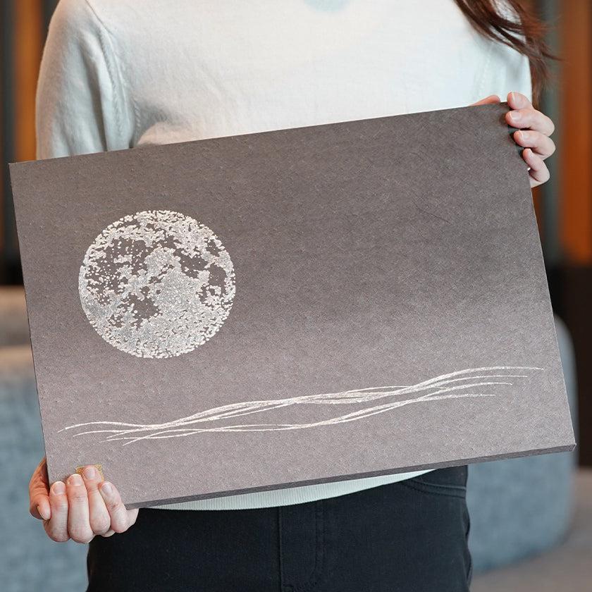 手漉き和紙に、版木に刷られた紋様を手刷りする、からかみの技法を用いて満月を刷りました。