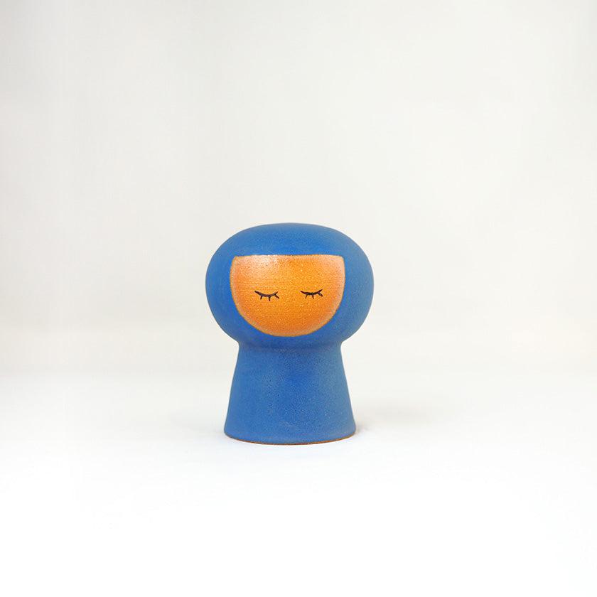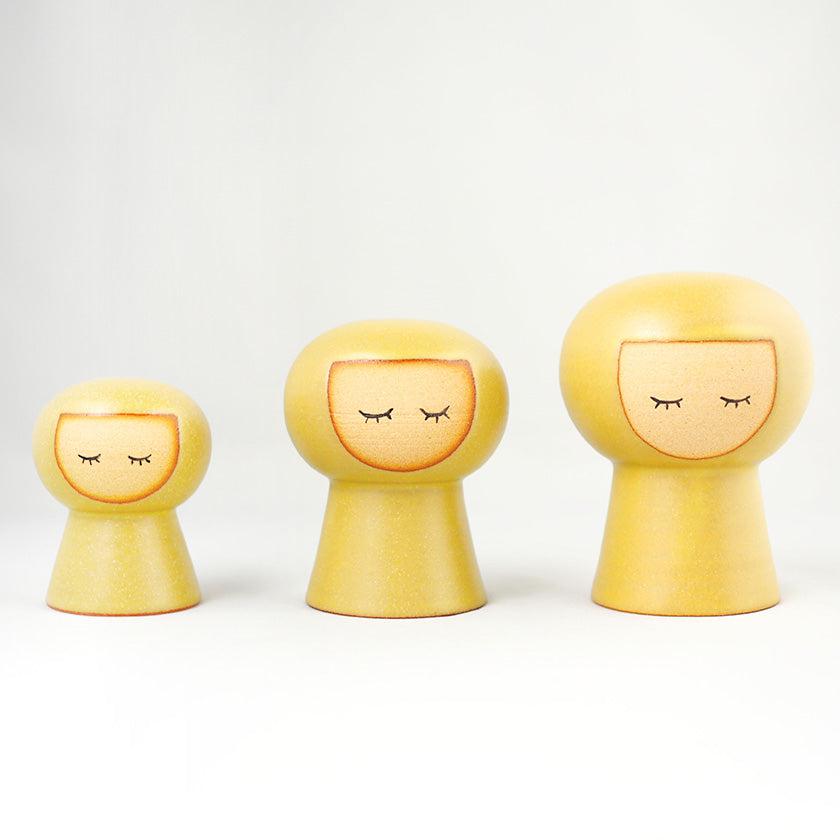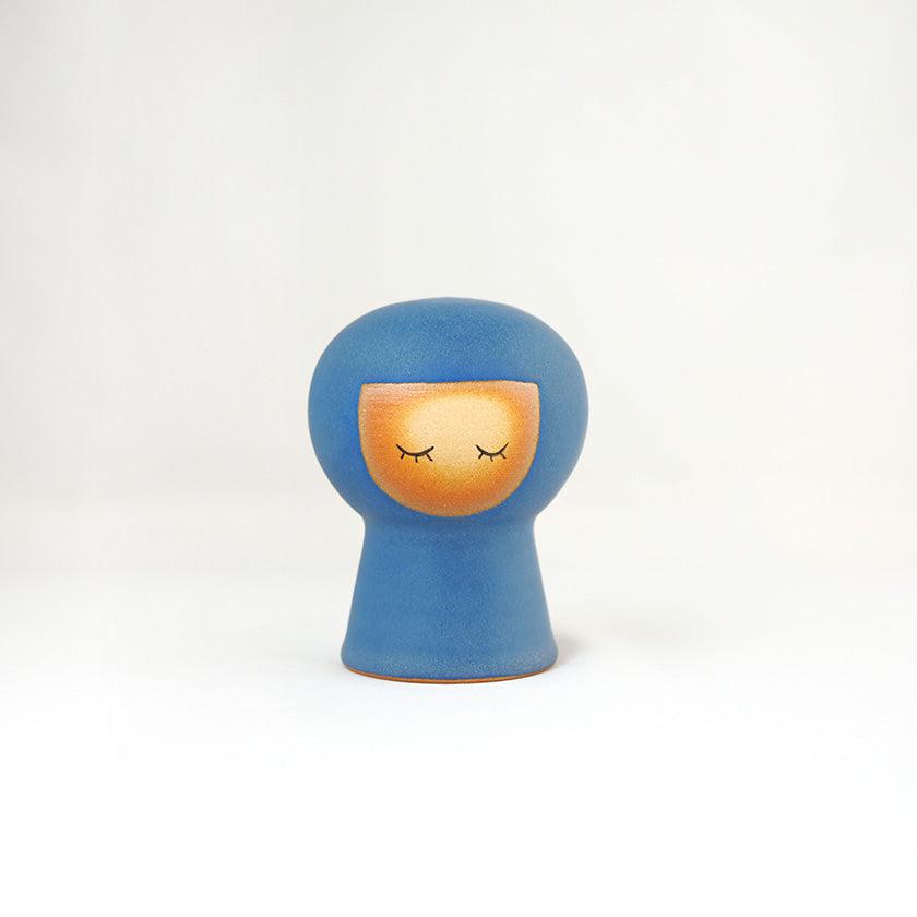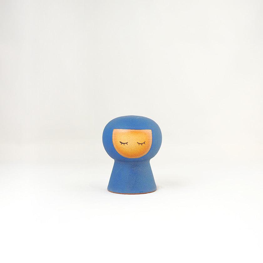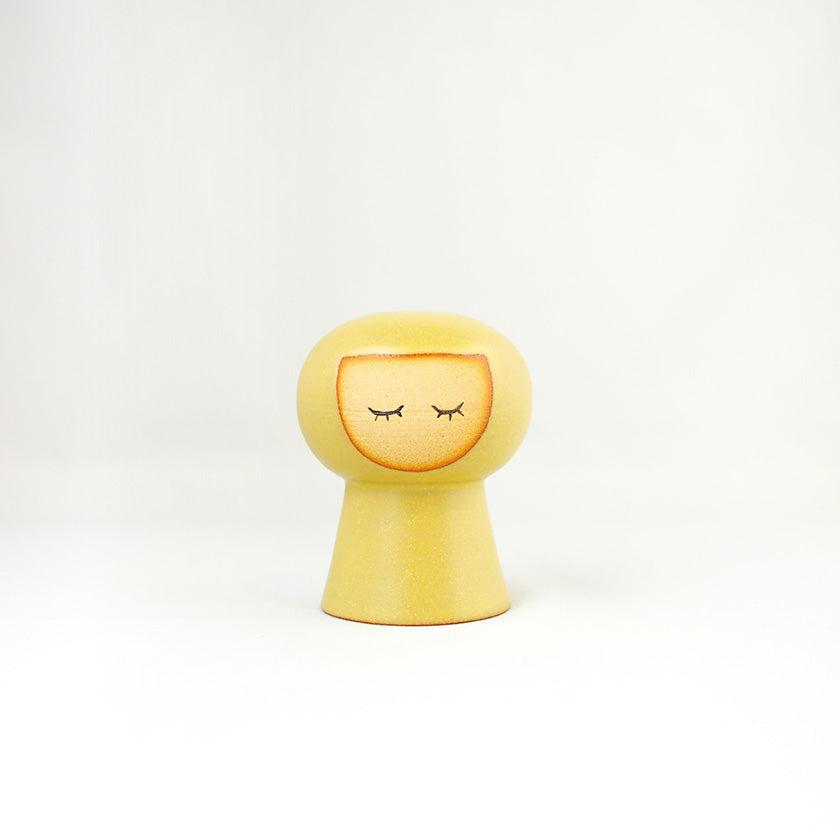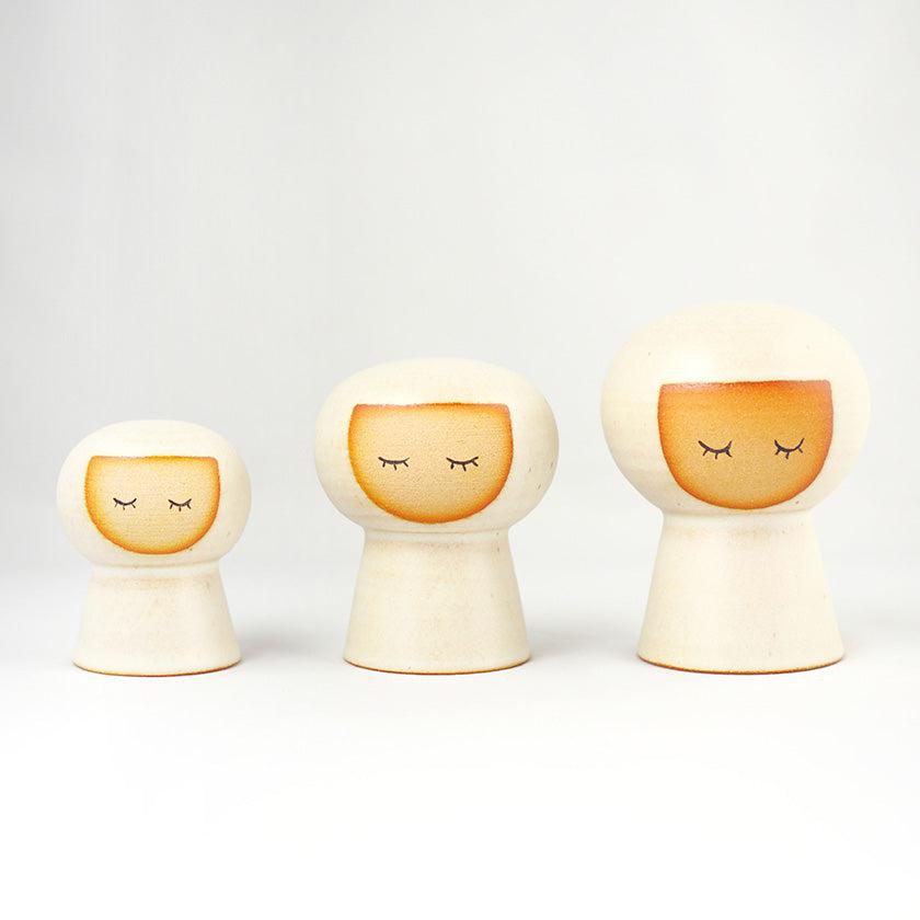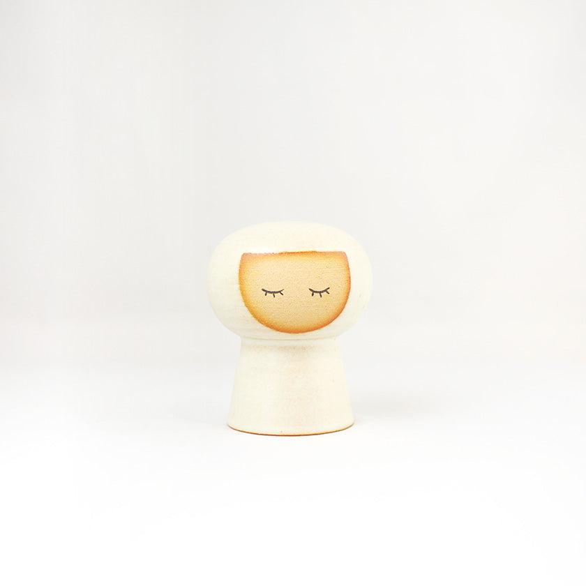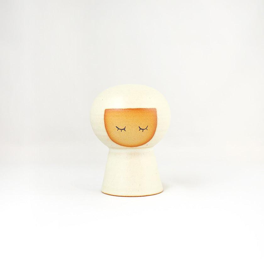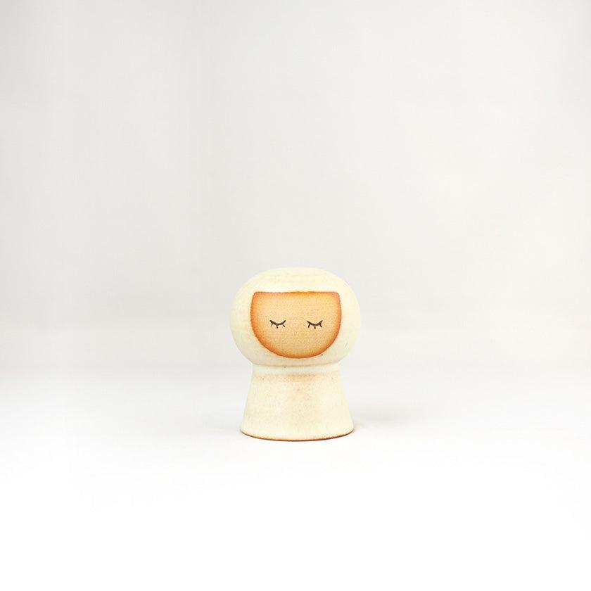 そんなこけしを、京焼・清水焼の技と現代的な感覚でかたちにしたのがこちらの商品。顔以外の部分に色が施された姿は、まるで頭巾を被っているかのよう。ゆるやかに裾が広がる女性らしいフォルムで、両目は祈るようにそっと伏せられています。