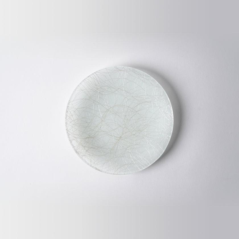 銀糸をふんだんに使って文様を織り成している西陣織の丸皿です。