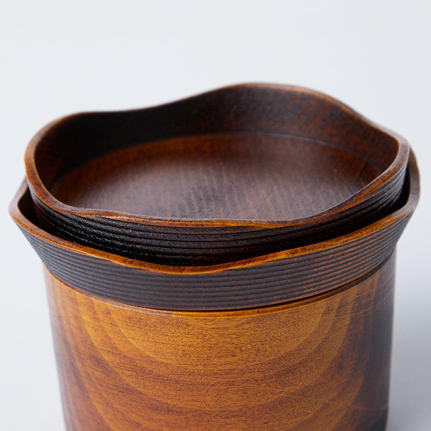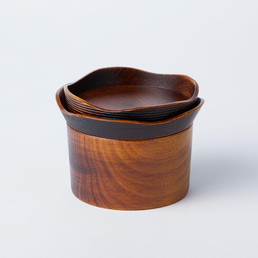 食器セットは、本体や2枚のお皿のどこをとって見ても木のやさしくなめらかな質感。職人の手仕事によって、丁寧にかたち作られていることが伝わります。お皿の縁の部分には「千筋」と呼ばれる細かい縞模様の装飾が施されていて、デザインのアクセントになっています。