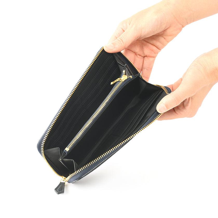 長財布なのでお札を折らずに収納でき、小銭やカードもたっぷり収納できます。