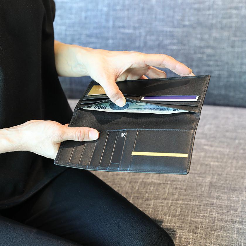 長財布のサイズは、約19cm×9.5cm。厚さは何も入れない状態で約1cm。小銭入れがついていない長財布で、スーツの内ポケットやビジネスバッグにも嵩張らずに入れられるのが魅力です。小銭を持ち歩かない人にはぴったりの、スリムな財布ですね。