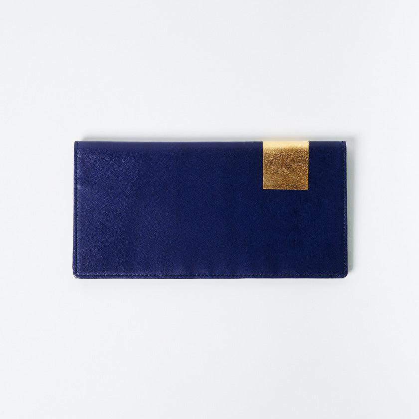 財布の外側にはカーブを覆うように配された金箔押しが1箇所。財布を開けると、ブランドネームが施された部分とさらにライン状の金箔押しが。すっきりとしたシンプルさのなかに、アーバンな印象を受けるこだわりのデザインです。