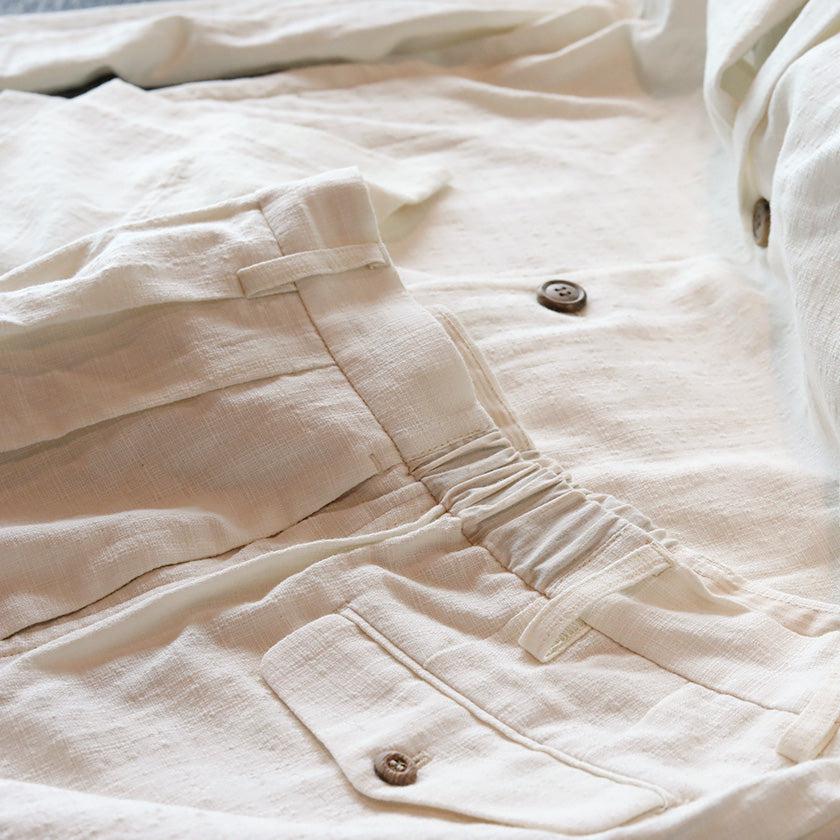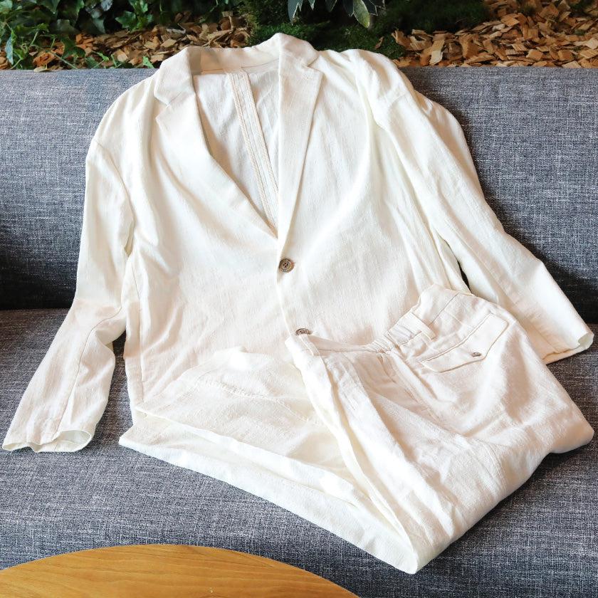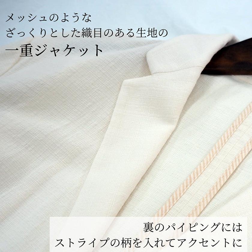 ジャケットは裏地のない一重仕立て。スラックスはウエストゴムと裏地にあるストライプ柄のパイピングがアクセントになっています。